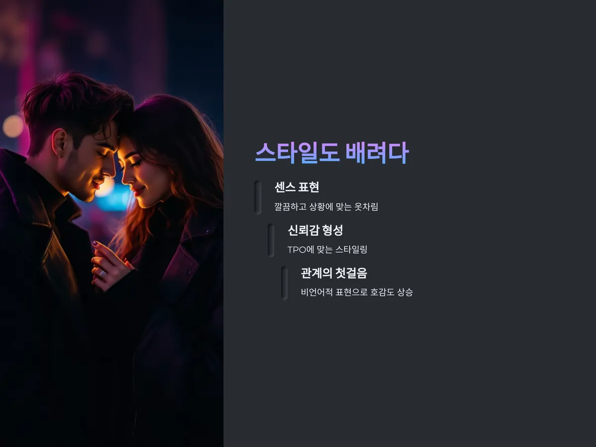 이번 가이드를 통해 단순히 옷을 고르는 데서 끝나는 것이 아니라, 나만의 스타일을 구축하고, 상대방과의 커뮤니케이션을 위한 ‘비언어적 표현’을 고민해보는 계기가 되길 바랍니다. 다음 데이트에서는 좀 더 자신감 있는 모습으로 마주할 수 있겠죠?