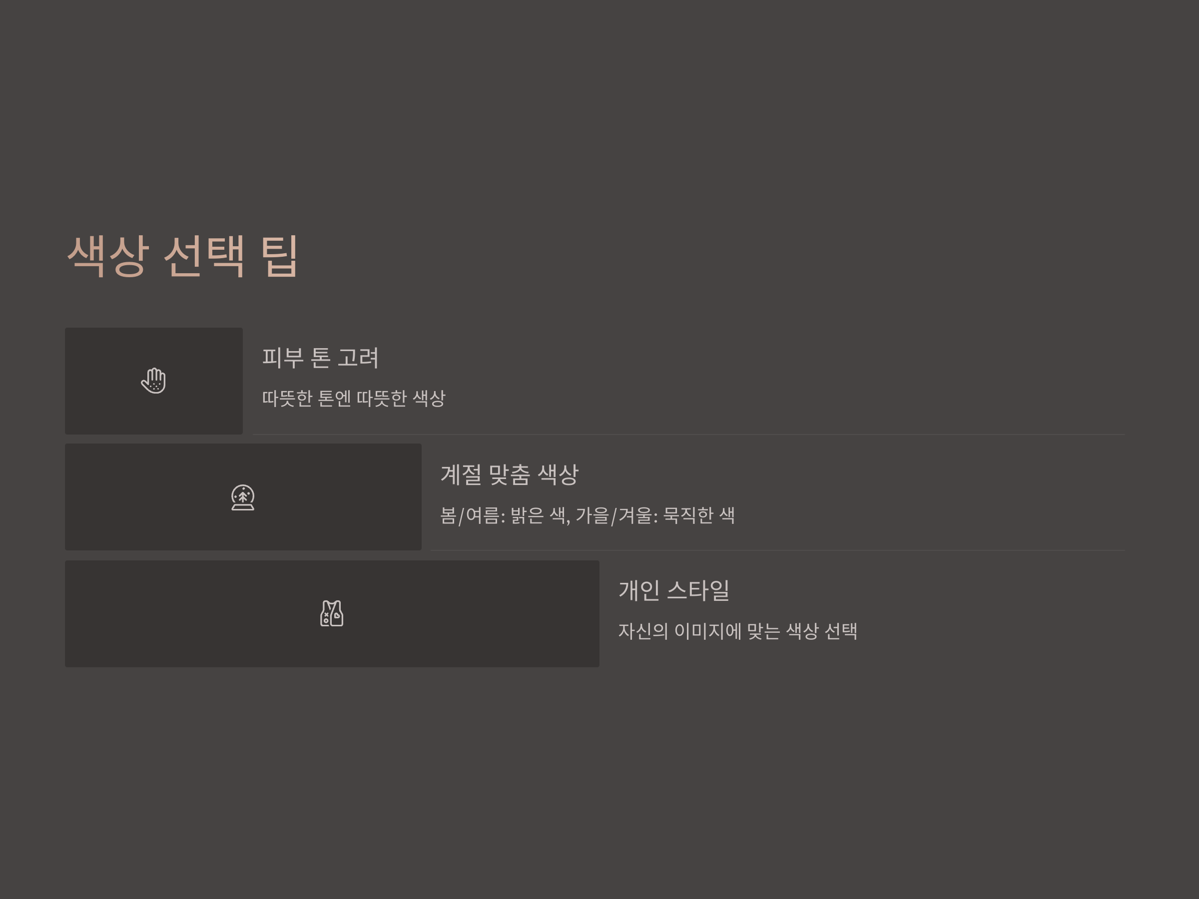 두 번째 팁은 계절에 맞는 색상 선택입니다. 봄과 여름에는 화사하고 밝은 색상들이 어울리며, 가을과 겨울에는 더 깊고 묵직한 색상들이 잘 어울립니다. 이를 통해 셀럽들처럼 계절과 상황에 맞는 컬러 매칭을 할 수 있습니다.