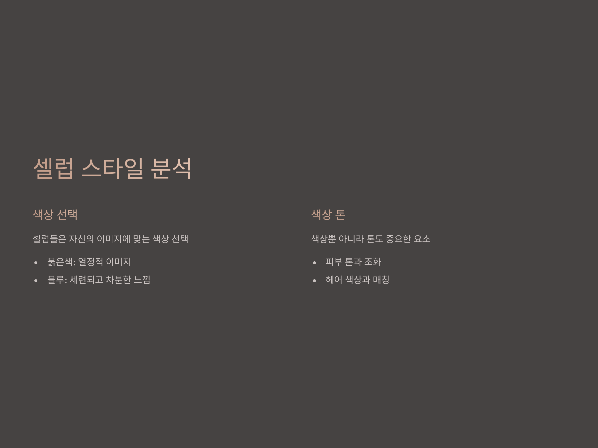 여기서 중요한 점은 색상뿐만 아니라 색상의 톤도 매우 중요한 요소라는 점입니다. 셀럽들이 선택한 색상이 어떻게 그들의 피부 톤, 헤어 색상과 어울리는지를 파악하고, 이를 통해 자신의 스타일을 어떻게 변형할 수 있는지 고민해야 합니다.