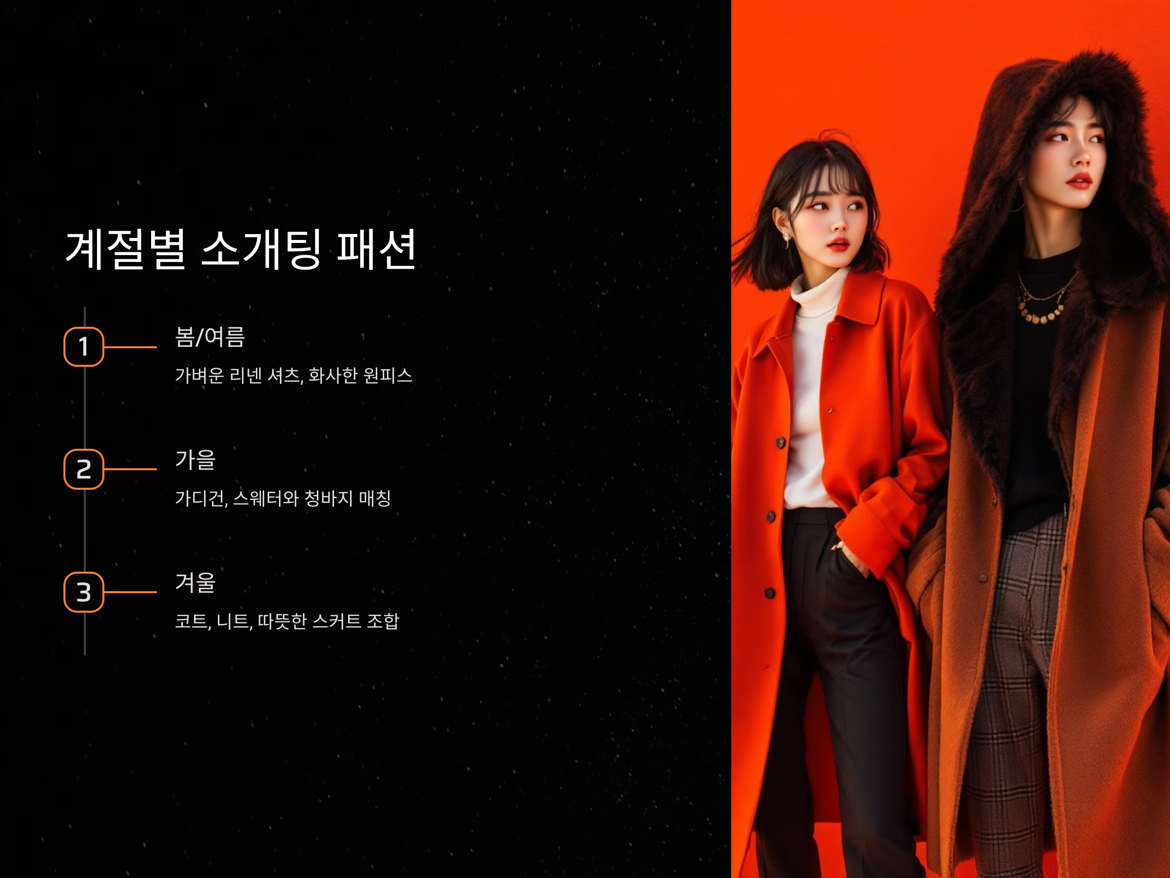 - 여성: 겨울에는 무릎 길이의 코트나 롱 코트에 니트와 따뜻한 스커트를 매칭할 수 있습니다. 패딩이나 두꺼운 외투보다는 여성스러움을 강조할 수 있는 깔끔한 코트를 추천합니다.