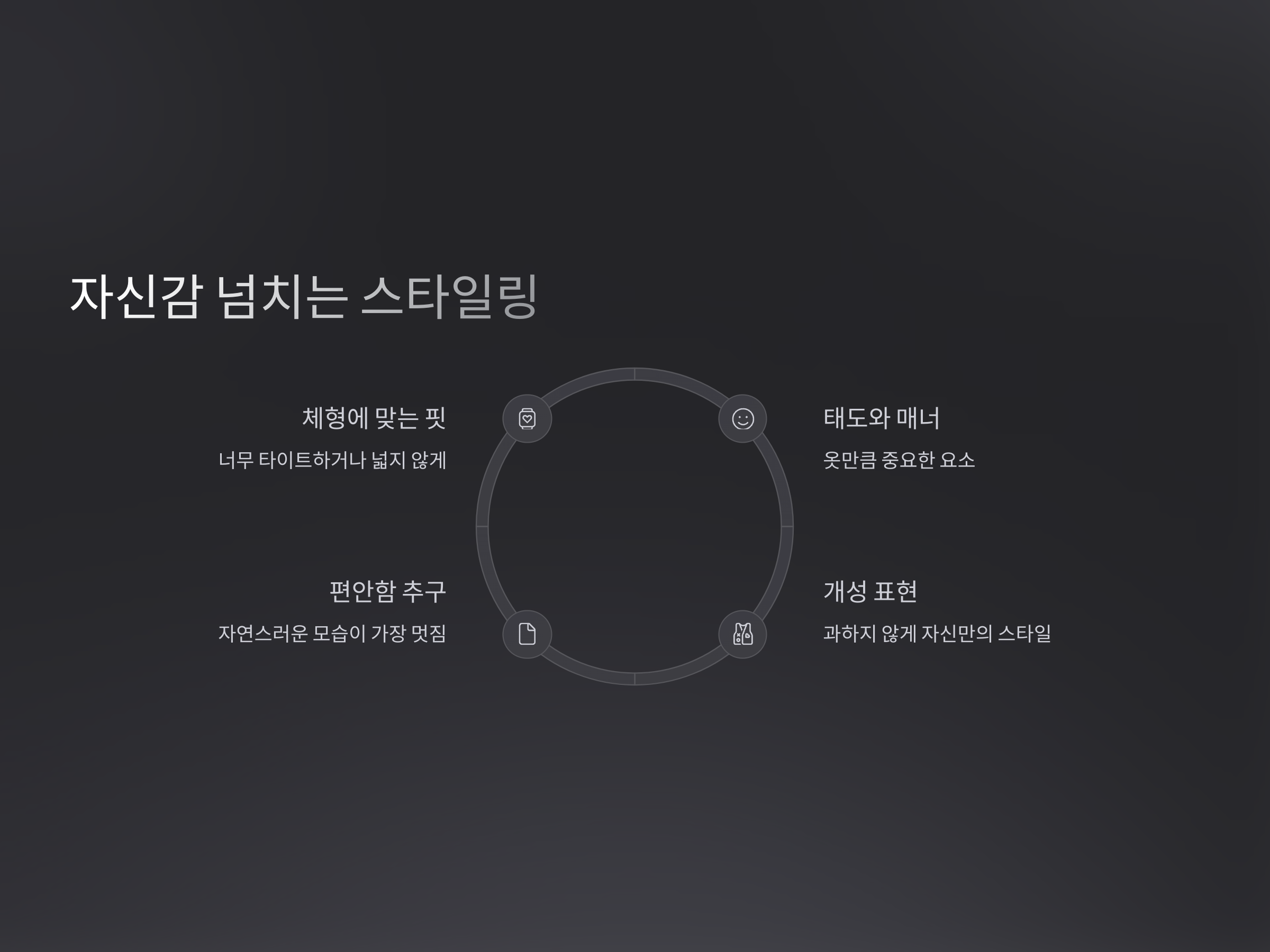 스타일에 자신감을 가질 수 있는 방법은 바로 자신에게 잘 맞는 옷을 입는 것입니다. 자신의 체형에 맞는 핏을 찾아보세요. 또한, 술자리에서는 태도와 말투도 중요한 역할을 하므로, 자칫 옷에 집중하느라 태도나 매너를 놓치지 않도록 주의해야 합니다. 자주 웃고, 상대방에게 관심을 보이는 등의 작은 행동들이 술자리에서의 매력을 더욱 높여줍니다.