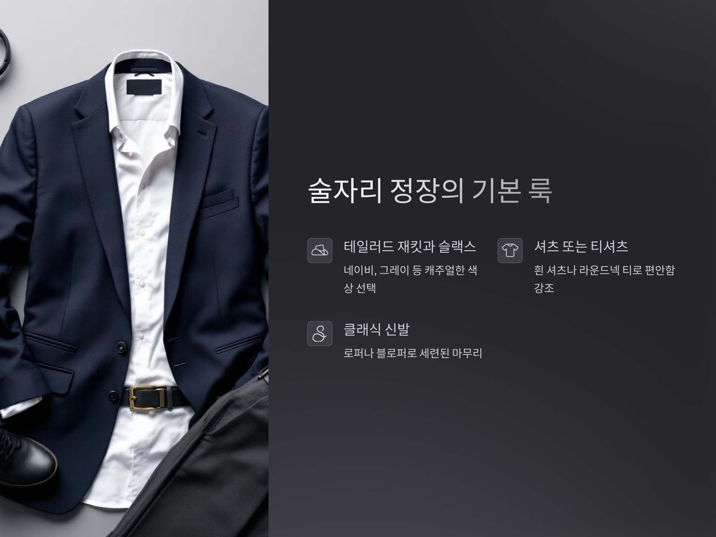 술자리에서 가장 중요한 것은 분위기에 맞는 자연스러운 스타일입니다. 일반적인 정장과는 다르게 너무 단정하거나 과도한 디테일이 있는 정장은 피하는 것이 좋습니다. 대신, 편안함과 스타일을 동시에 고려한 룩이 핵심입니다.