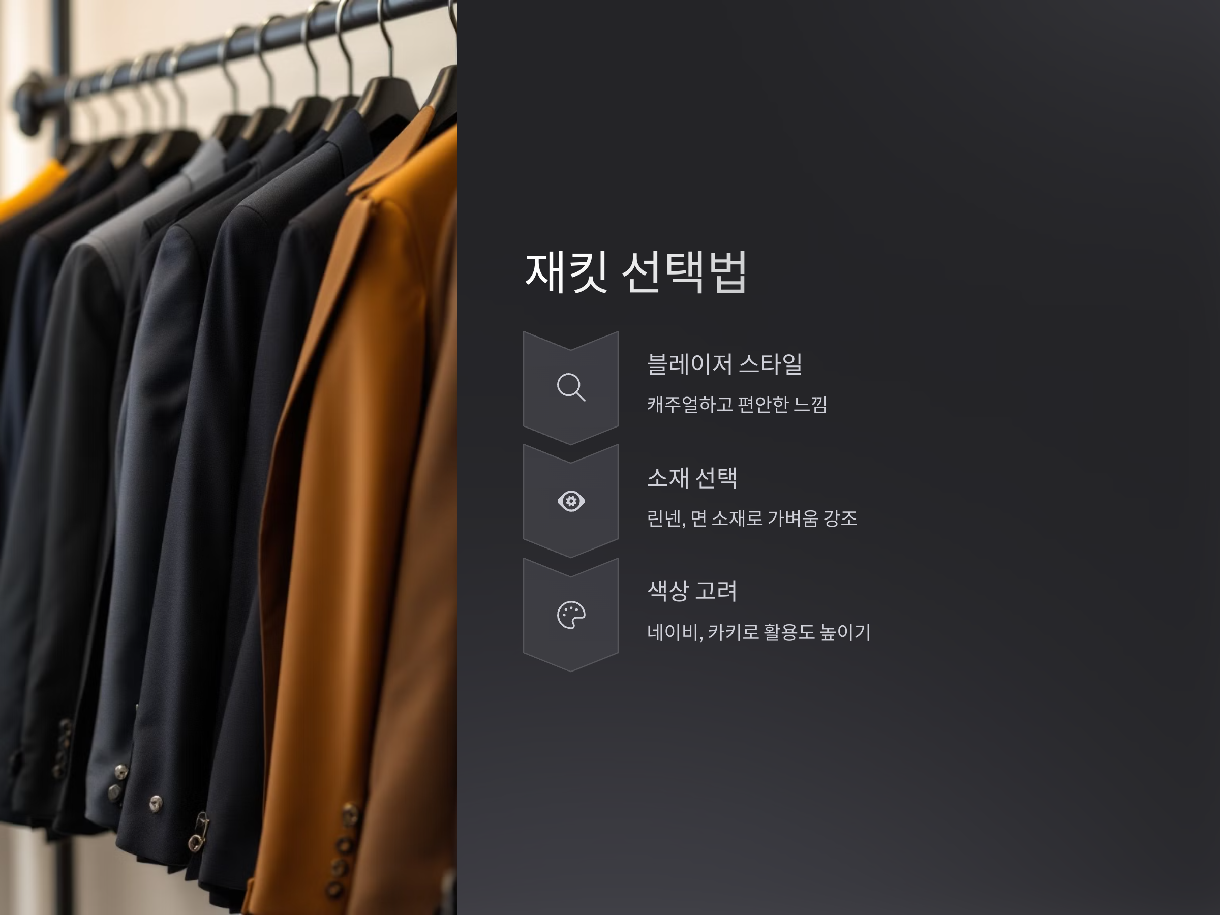 블레이저는 패브릭과 색상에 따라 술자리의 분위기를 바꿀 수 있습니다. 가벼운 린넨 블레이저나 면 소재의 블레이저는 여름 술자리에서 더욱 편안하고 스타일리시한 느낌을 줄 수 있습니다. 또한, 네이비나 카키 색상의 블레이저는 다양한 옷과 잘 어울려 활용도가 높습니다.