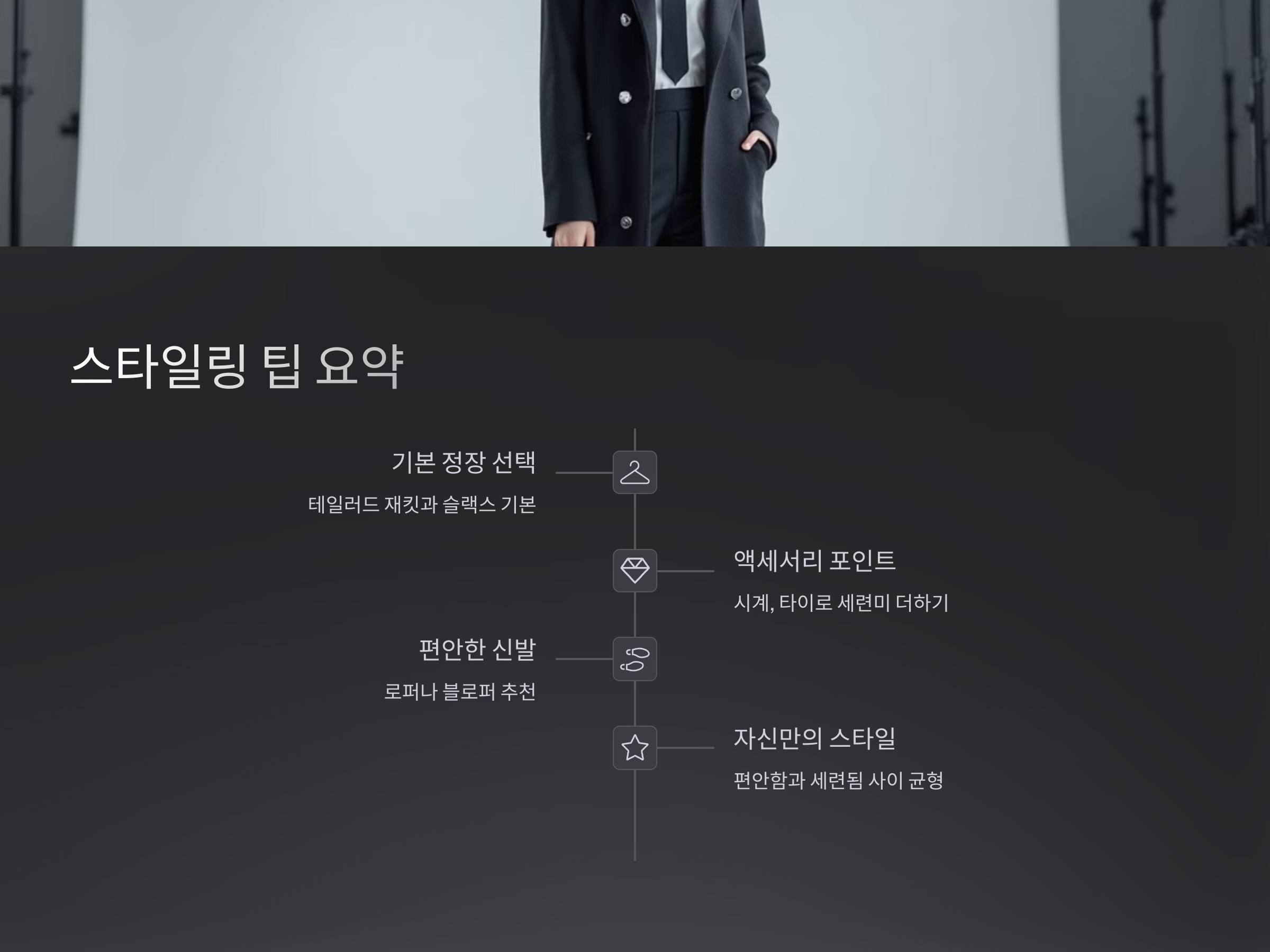 술자리에서의 정장 코디는 단순히 옷을 잘 입는 것만으로 끝나지 않습니다. 옷의 색상, 핏, 액세서리, 신발 등 모든 요소가 어우러져 자연스럽고 멋스러운 스타일을 만들어냅니다. 또한, 술자리에서는 편안하면서도 자신감 넘치는 스타일을 유지하는 것이 중요합니다. 너무 부담스럽지 않게, 그리고 너무 캐주얼하지 않게 스타일링을 해야 합니다.