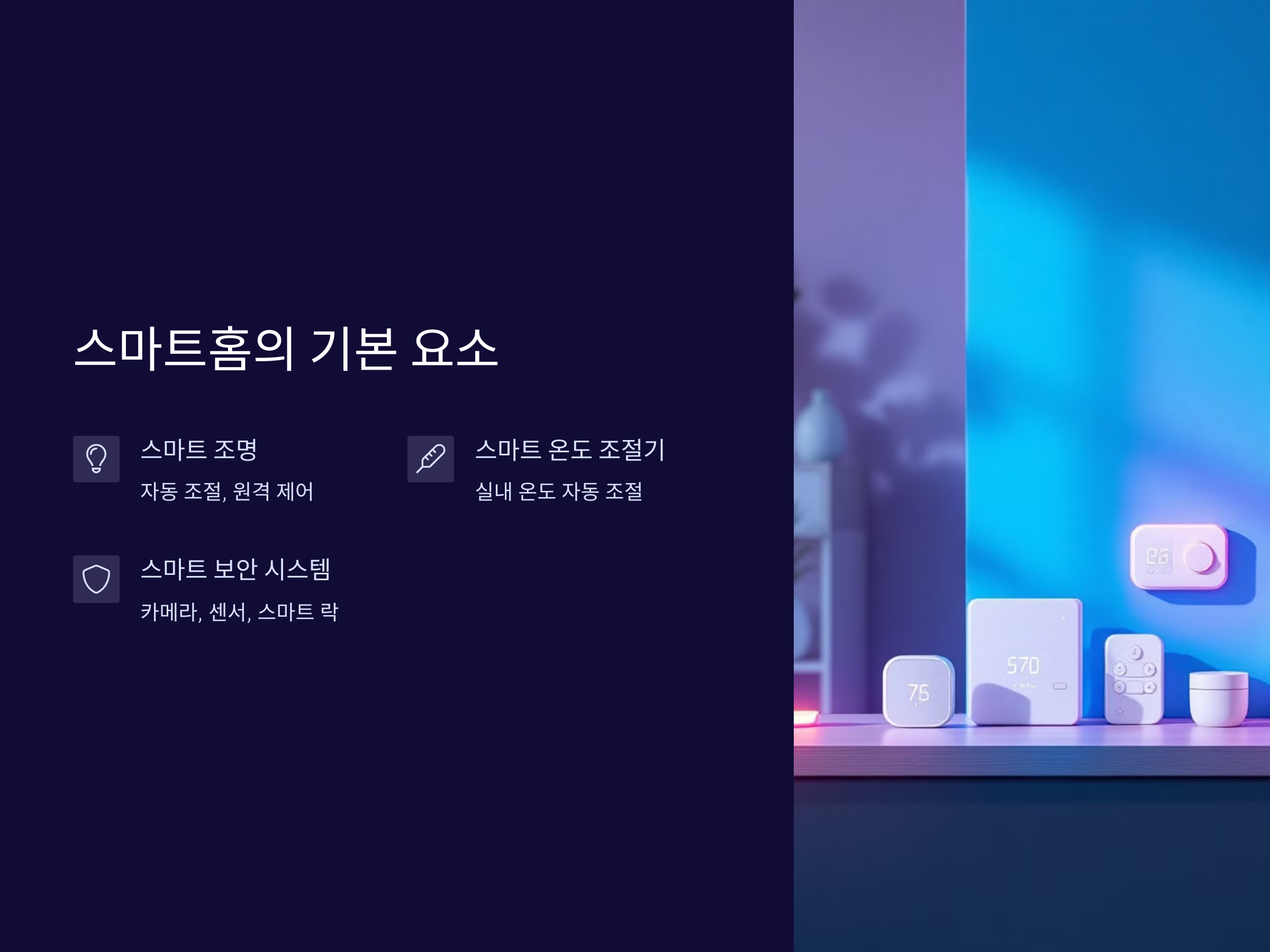 스마트홈 인테리어의 핵심은 바로 '연결성'입니다. 집 안의 모든 기기가 서로 연결되어 있어야 하며, 이를 통해 집의 다양한 시스템을 스마트폰이나 음성 명령 등으로 제어할 수 있습니다. 스마트홈의 기본 요소는 다음과 같습니다: