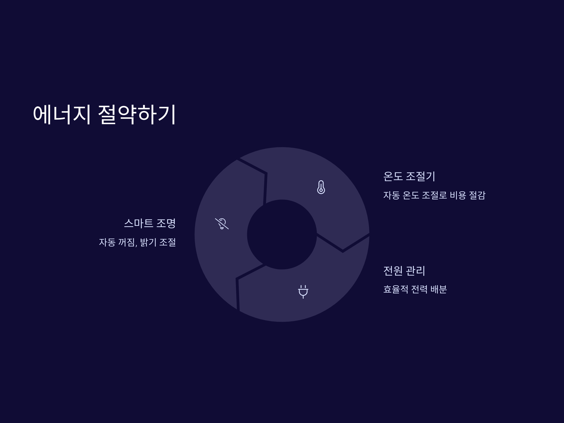 - 스마트 온도 조절기: 실내 온도를 자동으로 조절해주는 시스템입니다. 예를 들어, 집을 떠날 때 자동으로 온도를 낮추고, 집에 돌아올 때는 미리 설정된 온도로 맞춰집니다.