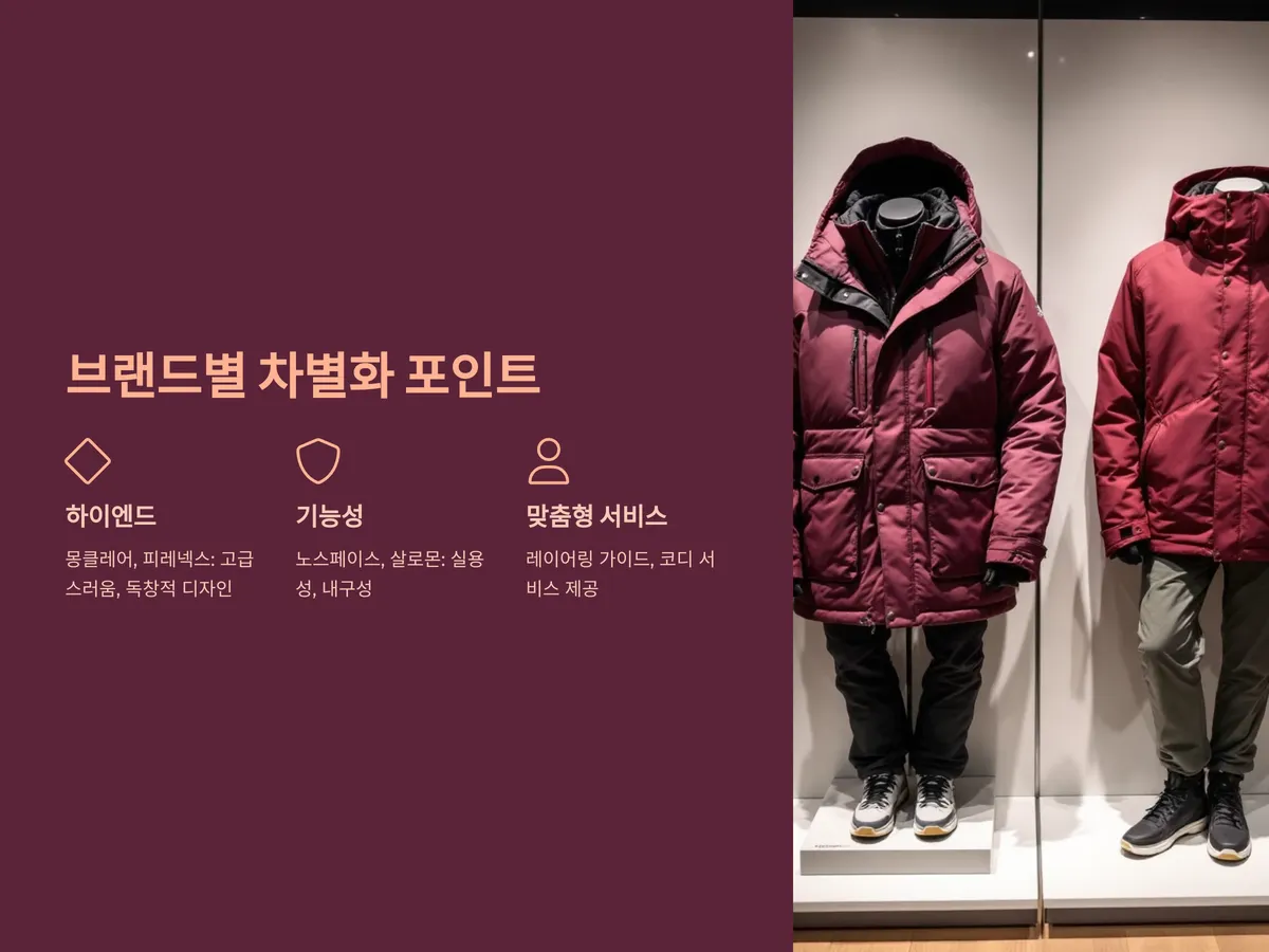 오늘날 스키복 시장은 고가의 하이엔드 브랜드부터 대중적인 기능성 브랜드까지 다양화되어 있으며, 브랜드별로 확실한 포지셔닝 전략을 세우고 있습니다. 몽클레어, 피레넥스, 골드윈 등은 고급스러운 이미지와 독창적인 디자인을 무기로 삼고 있고, 노스페이스, 살로몬, 컬럼비아 등은 기능성 위주로 실용성과 내구성을 강조합니다.