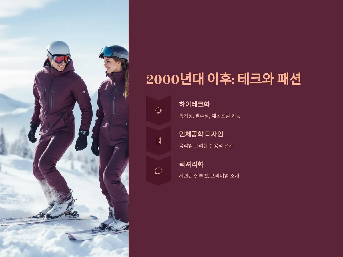 2000년대 이후 스키장 패션은 더욱 전문화되고 하이테크화되었습니다. 단순히 방수와 방풍 기능을 넘어 통기성과 발수성, 체온 조절 기능이 포함된 하이브리드 제품들이 주류로 자리잡기 시작했습니다. 브랜드들은 스키장에서의 움직임을 고려한 인체공학적 디자인을 적용하며, 실용성과 스타일을 모두 만족시키는 방향으로 진화하고 있습니다.