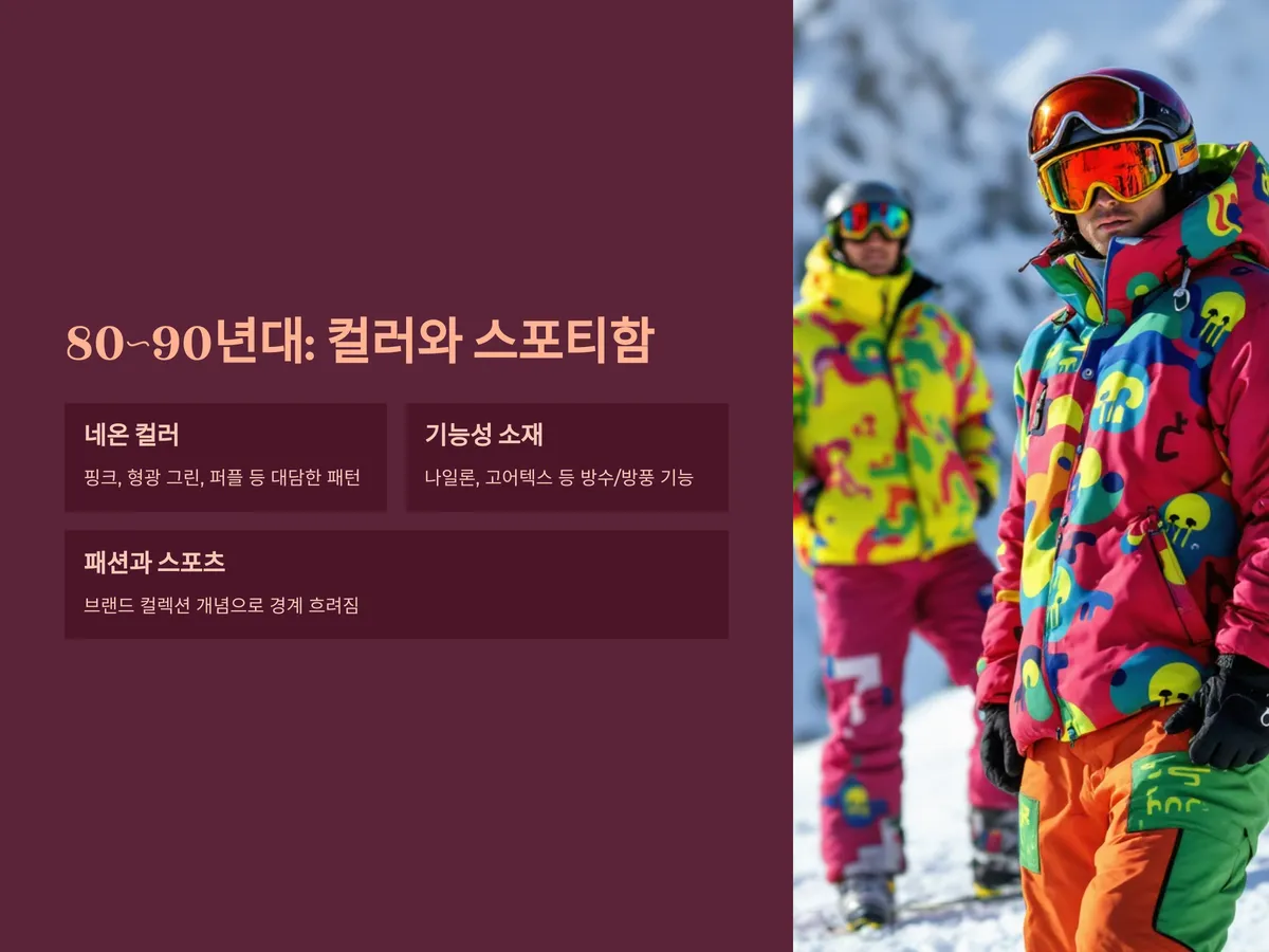 1980~90년대에 들어서면서 스키장 패션은 급격히 대중화되며, 비로소 '스타일'이 중요하게 다뤄지기 시작했습니다. 이 시기의 가장 큰 특징은 네온 컬러와 대담한 패턴의 사용입니다. 핑크, 형광 그린, 퍼플 등의 컬러는 눈 위에서 더욱 돋보였고, 그 자체로 스키장의 활기를 표현하는 수단이 되었습니다.