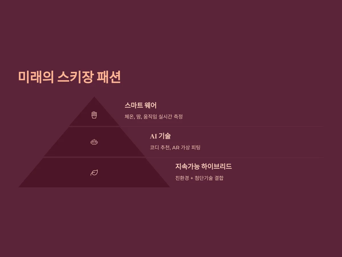 다가올 미래에는 '스마트 웨어'가 스키장 패션의 핵심 키워드가 될 전망입니다. 체온, 땀, 움직임 데이터를 실시간으로 측정하여 자동으로 온도를 조절하거나 습도 조절 기능이 있는 스마트 스키복이 상용화될 가능성이 높습니다. 또한 AI 기반의 코디 추천, AR 기술을 통한 가상 피팅 서비스 등이 보편화되며, 쇼핑 경험 자체도 혁신적으로 바뀔 것입니다.