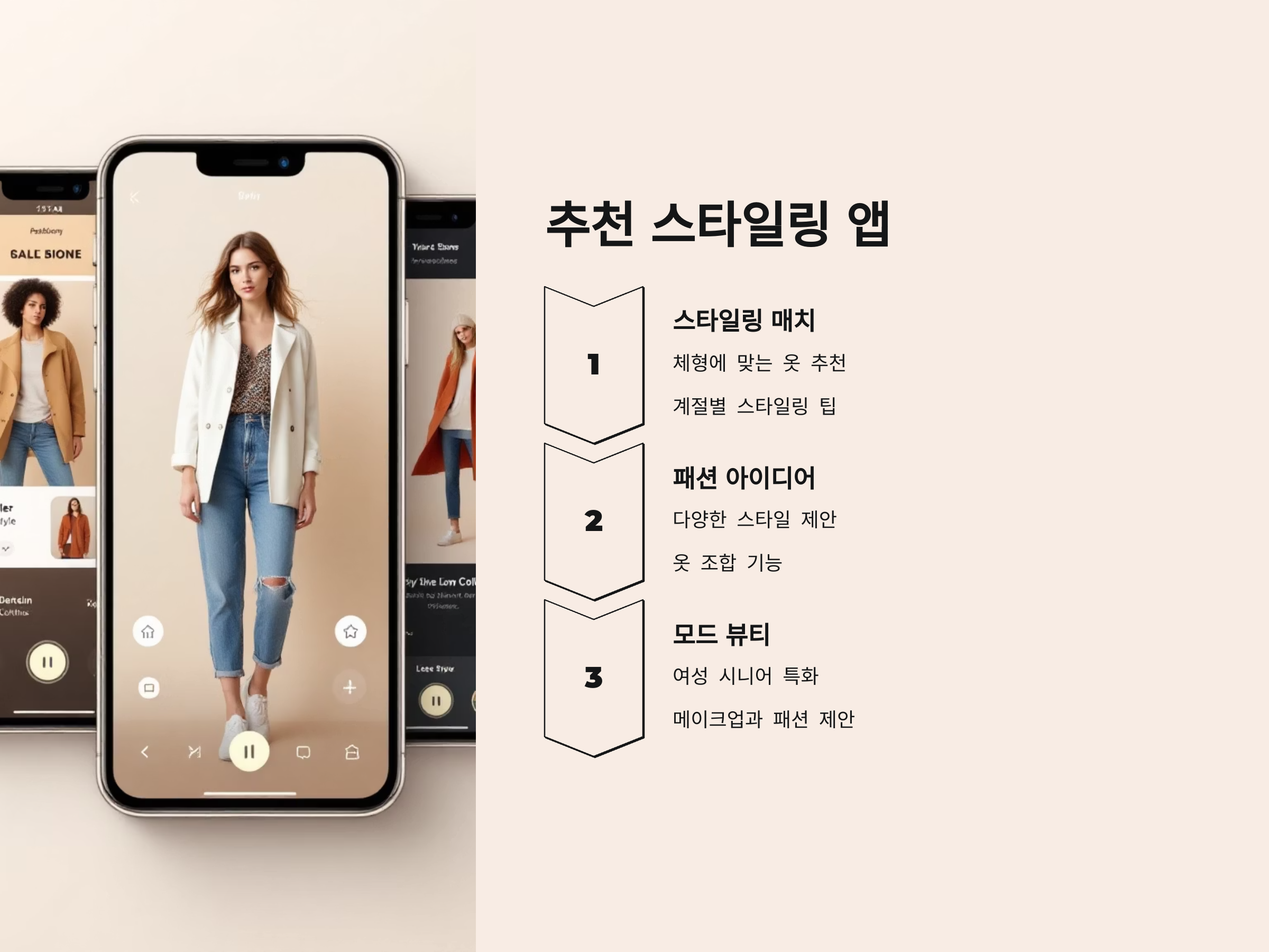 이 앱은 여성 시니어들을 위한 스타일링과 뷰티 앱입니다. 사용자의 나이에 맞는 스타일을 추천해주며, 피부 톤과 체형을 고려한 메이크업과 패션 아이템을 제안합니다. 이 앱은 패션뿐만 아니라 뷰티 요소도 고려하여 더욱 완성도 있는 스타일을 제안합니다.