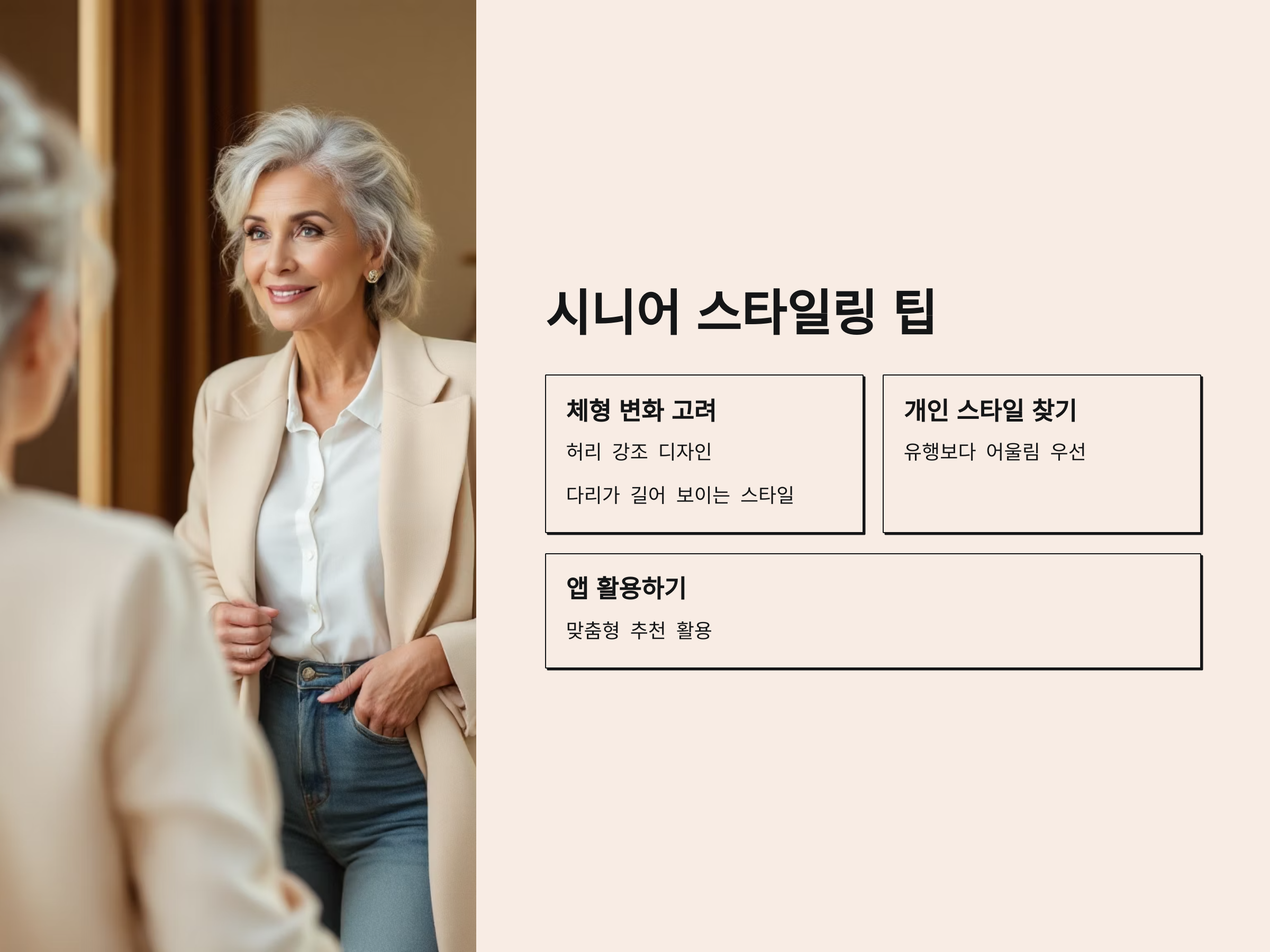 시니어 스타일링의 가장 큰 포인트는 바로 체형 변화에 맞는 옷을 고르는 것입니다. 나이가 들면서 체형이 변화하는 것은 자연스러운 일이지만, 스타일링을 통해 이 변화를 매력적인 모습으로 바꿀 수 있습니다. 예를 들어, 허리를 강조할 수 있는 디자인이나 다리가 길어 보이는 스타일을 선택하는 것이 좋습니다. 또한, 시니어들이 선택할 때 유의해야 할 점은 무조건 유행을 쫓기보다는 자신에게 어울리는 스타일을 고르는 것입니다. 스타일링 앱은 이런 부분에서 매우 유용하게 작용합니다.