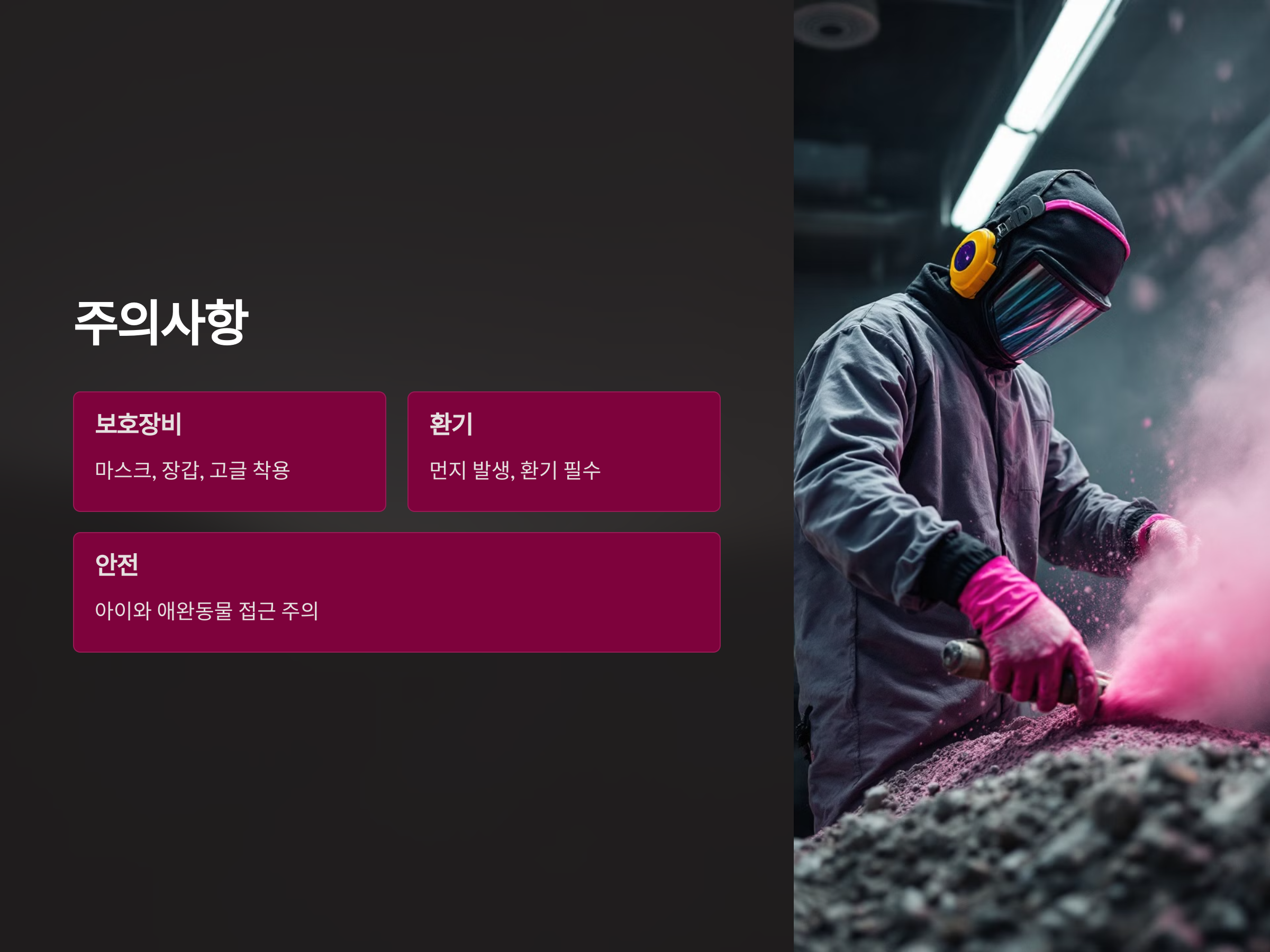 - 보호장비 착용: 마스크, 장갑, 고글 등 보호장비를 반드시 착용하세요.