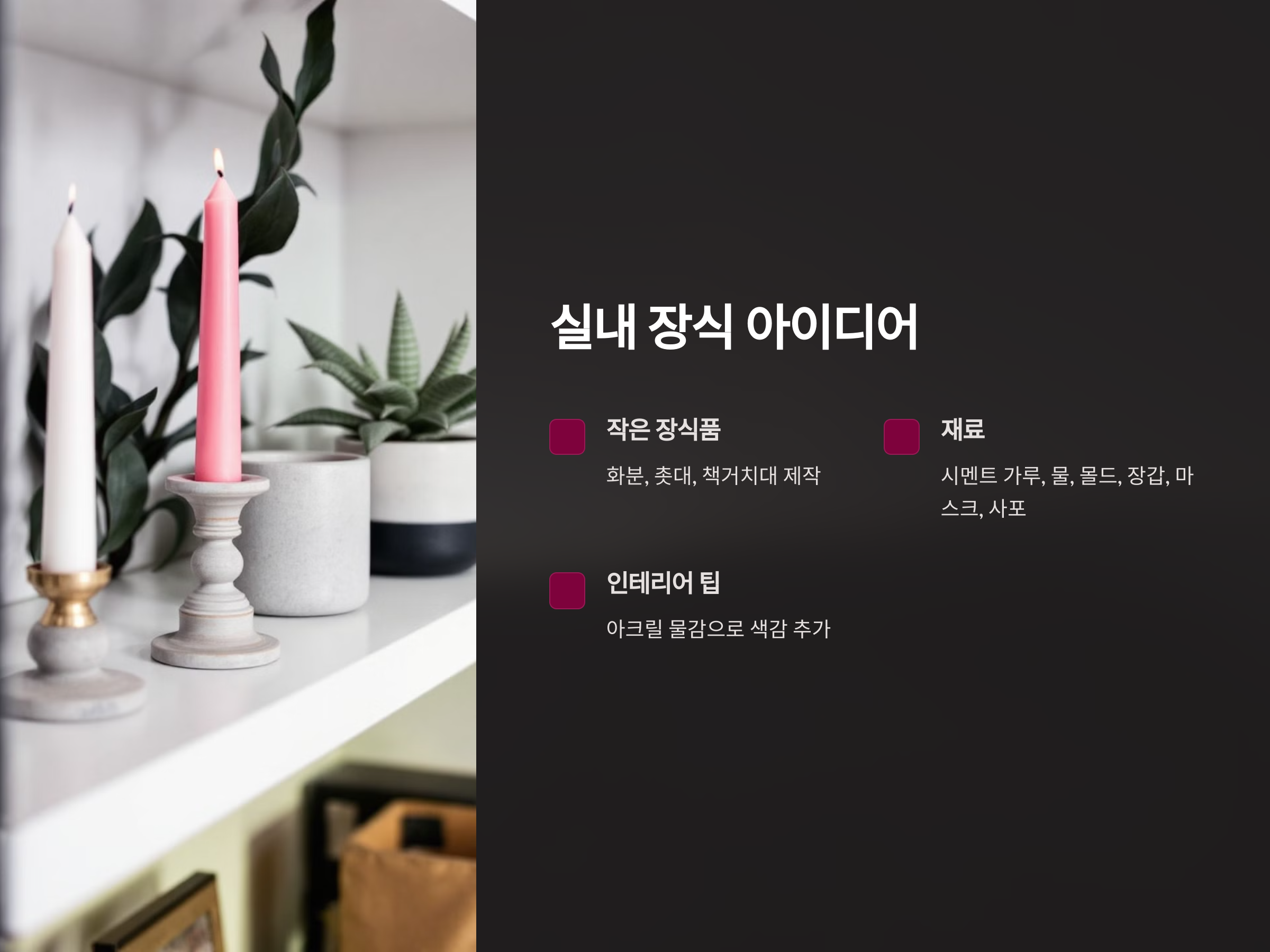 시멘트는 집안의 분위기를 한층 더 고급스럽게 만들어주는 데 유용합니다. 시멘트를 활용해 화분, 촛대, 또는 책거치대를 만들어 보세요.