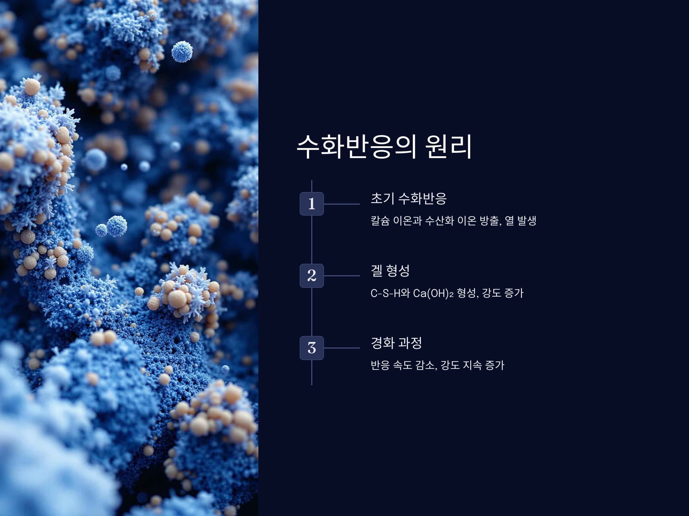 시멘트와 물이 반응하면 여러 화학물이 생성됩니다. 그중 가장 중요한 것은 C-S-H(Calcium-Silicate-Hydrate)로, 이는 강도와 내구성을 제공하는 핵심 물질입니다.