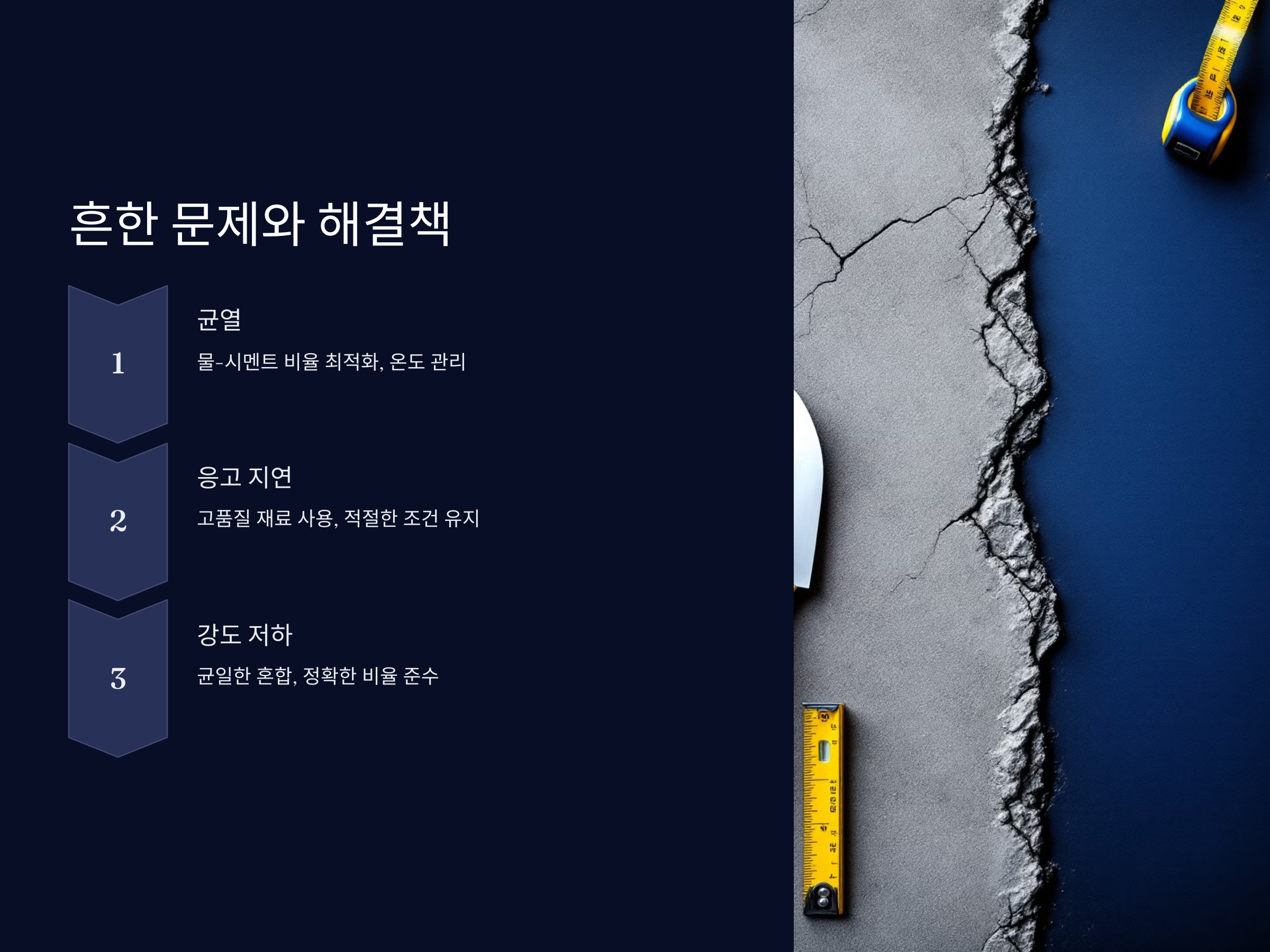 - 균열: 물의 비율이 높거나 온도 변화가 심할 경우 발생할 수 있습니다. 이를 방지하려면 물-시멘트 비율을 최적화하고 온도 관리를 철저히 해야 합니다.
