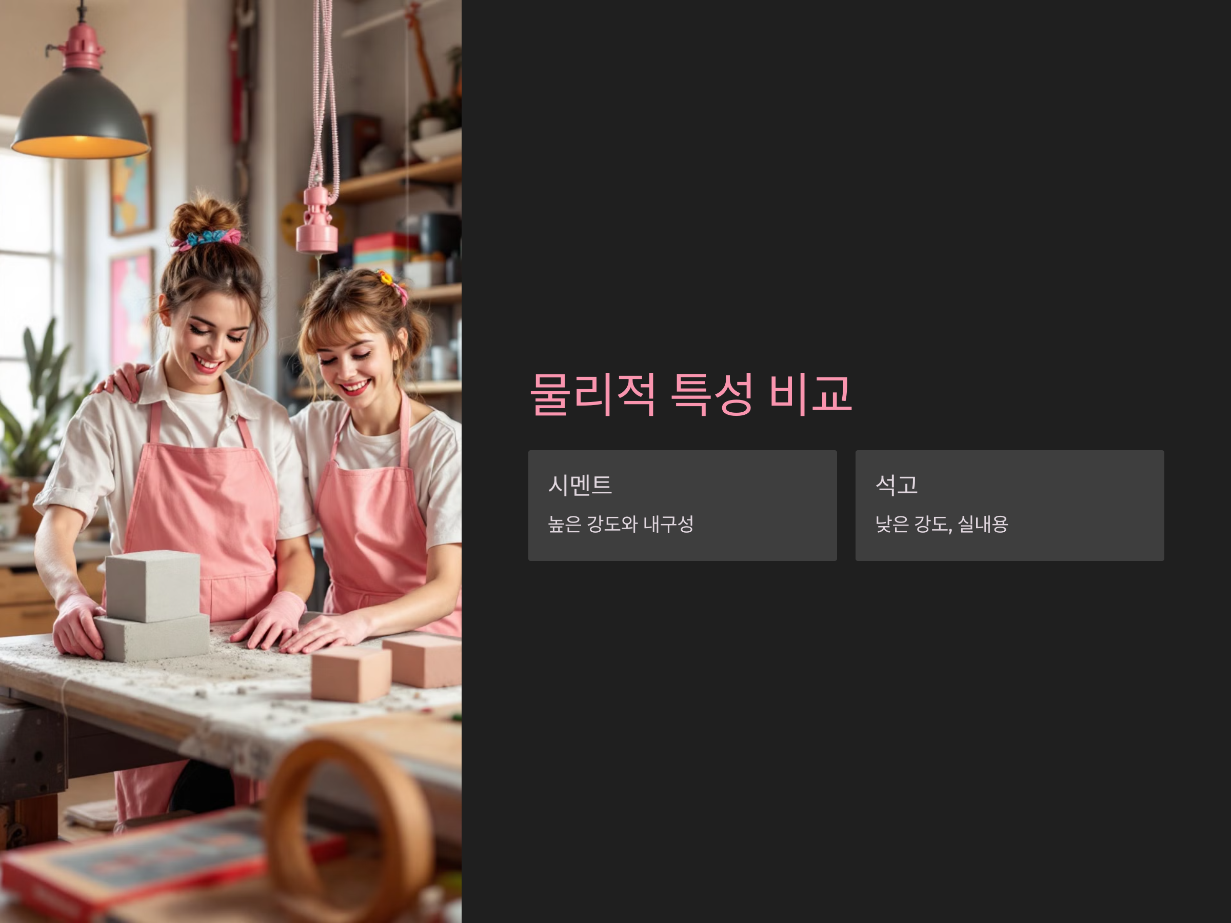 - 시멘트: 경화 후 매우 높은 강도와 내구성을 가지며 외부 환경(습기, 온도 변화)에 강하다.
