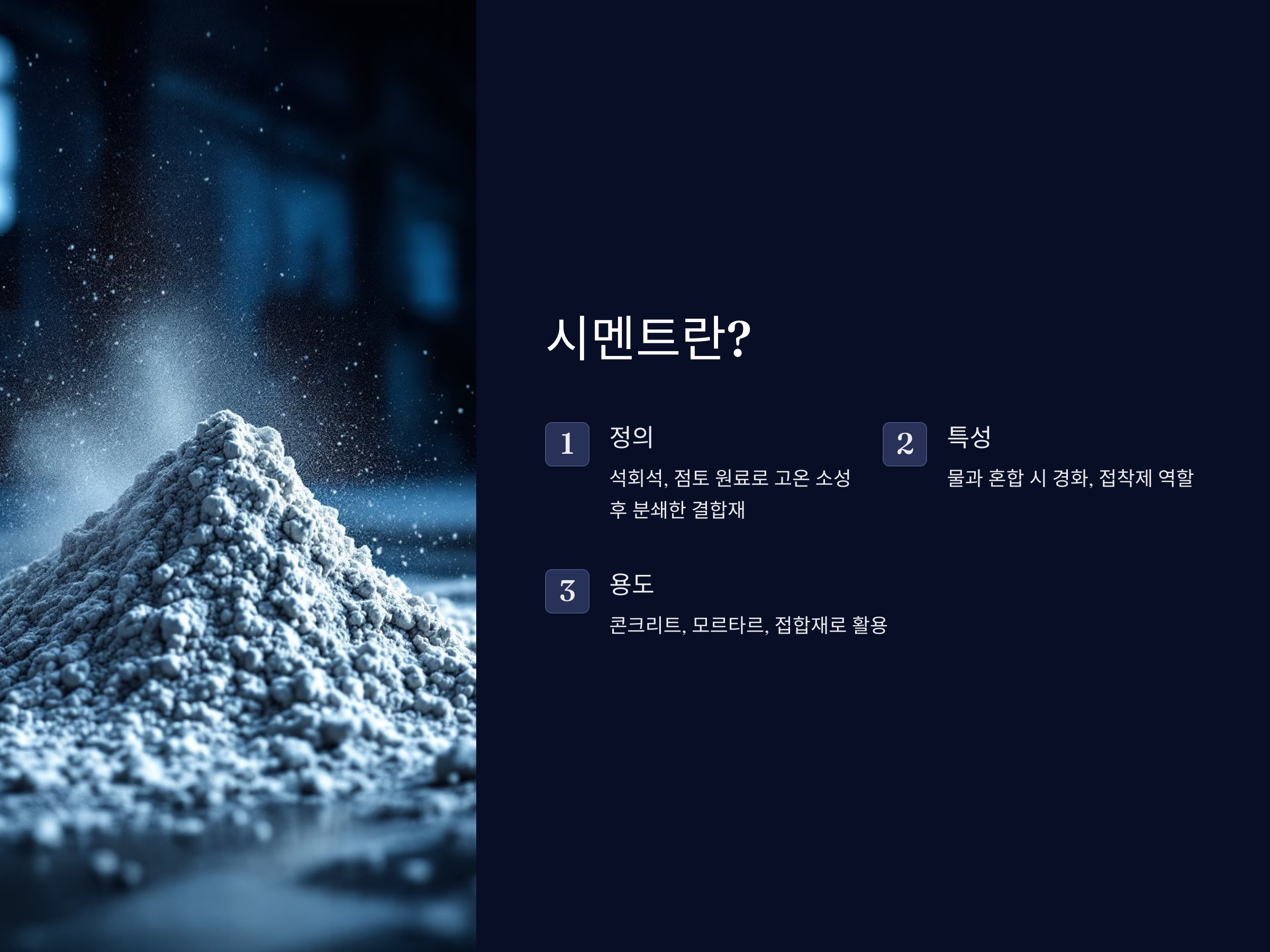 - 경화 반응: 물과 섞이면 화학 반응(수화작용)을 통해 단단해집니다.