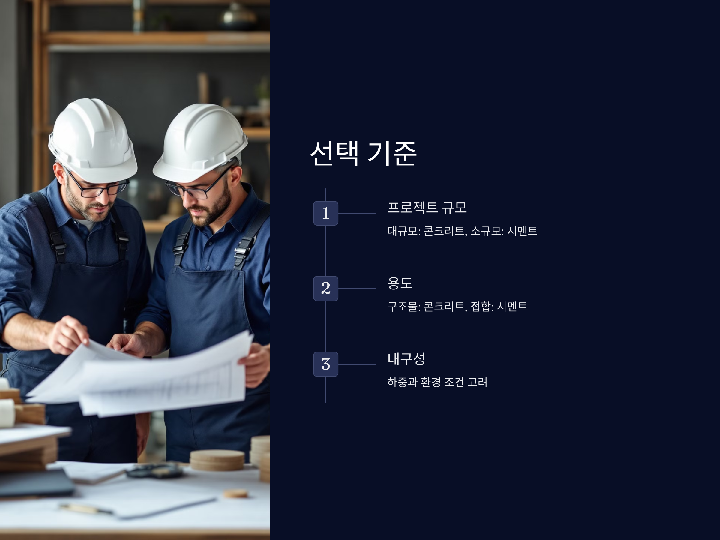 - 내구성 요구 수준: 구조물의 하중과 환경 조건에 따라 선택.