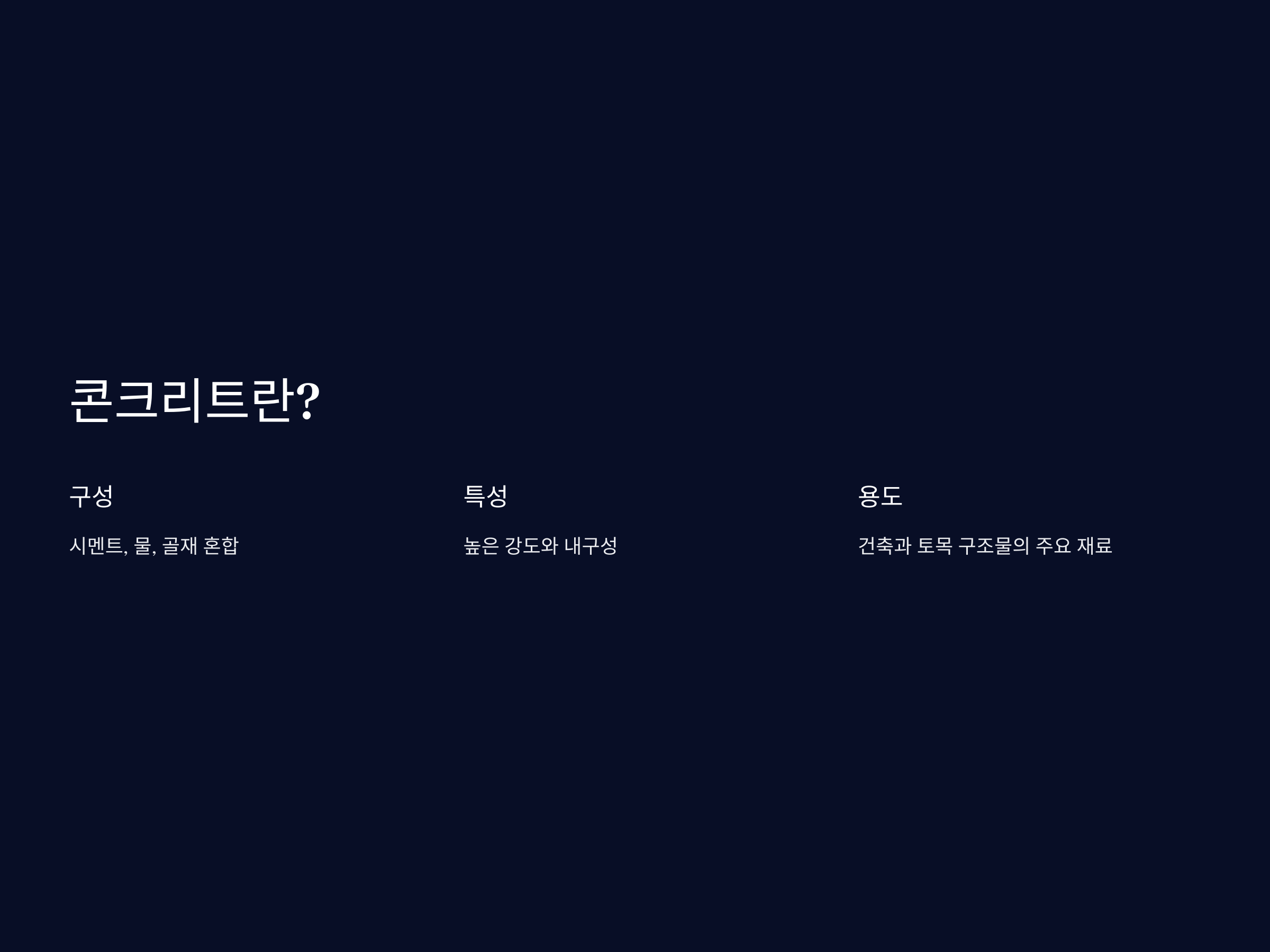 콘크리트는 시멘트, 물, 골재(모래, 자갈 등)를 적절히 혼합하여 만든 복합 재료입니다. 경화 후에는 매우 높은 강도와 내구성을 가지며, 건축과 토목 구조물의 주요 재료로 활용됩니다.