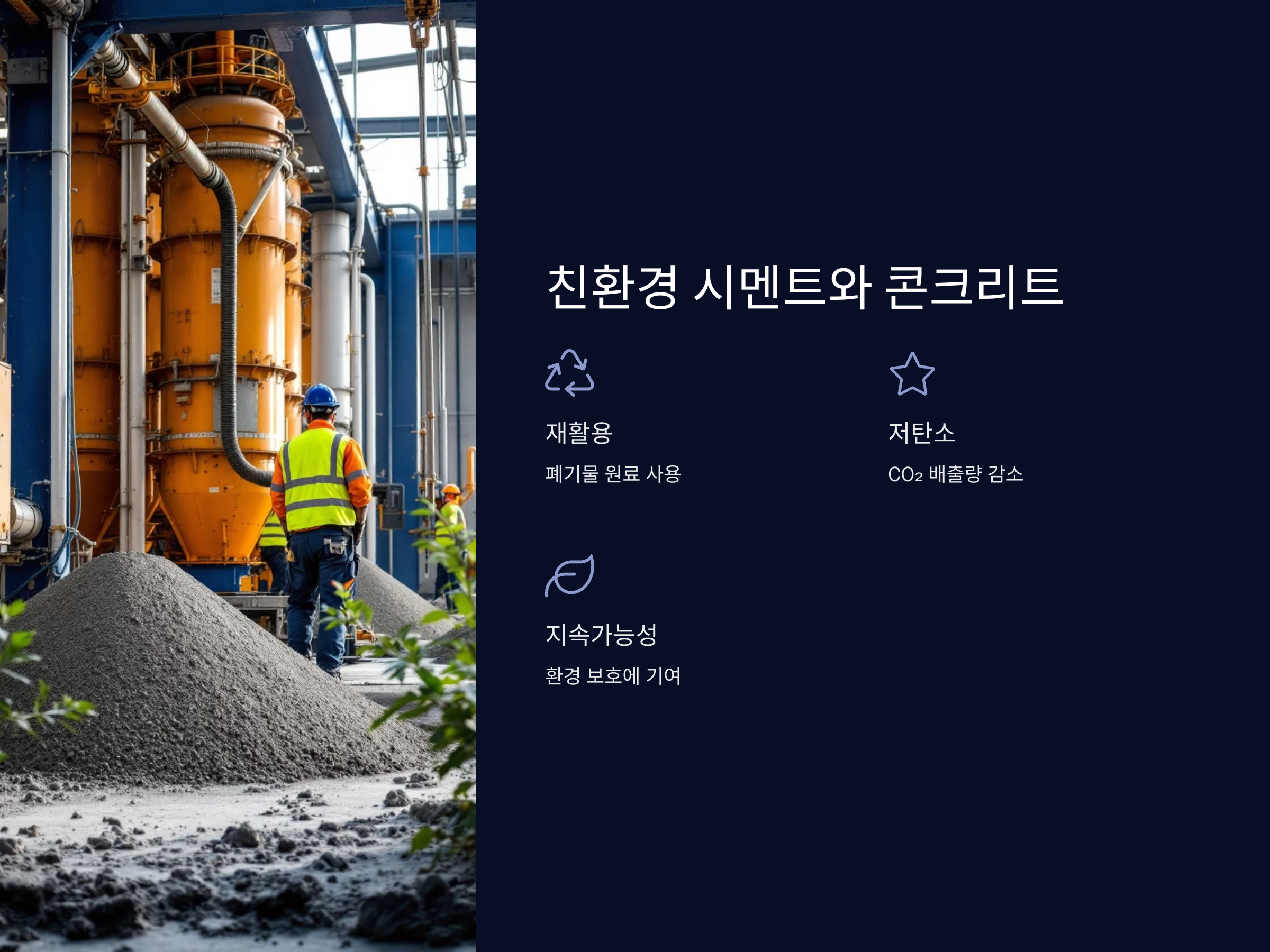 - 친환경 시멘트: 폐기물을 원료로 사용하며, 제조 과정에서 탄소 배출을 줄입니다.