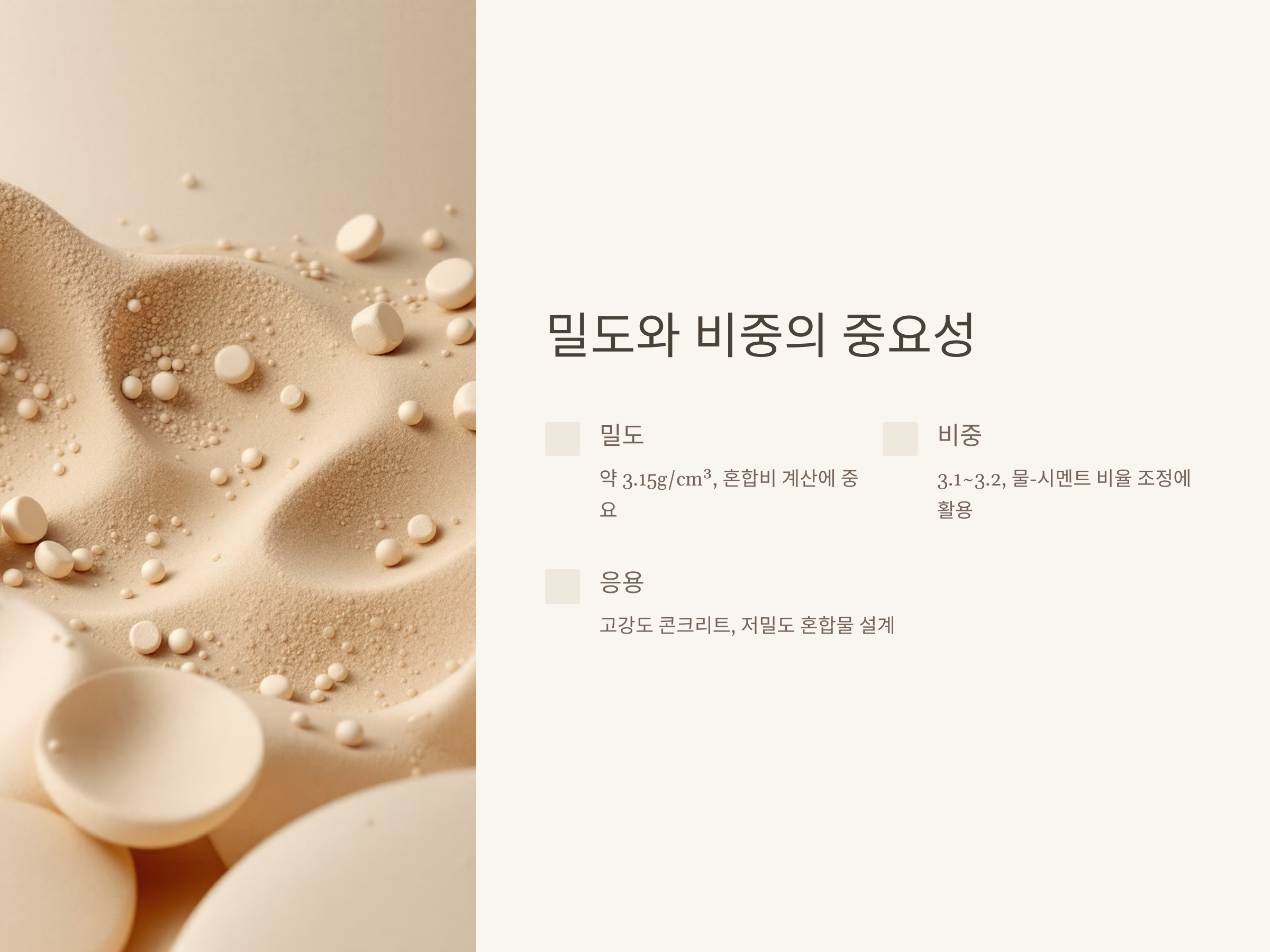 - 비중: 시멘트의 비중은 물과 비교한 상대적인 무게를 뜻하며, 일반적으로 3.1~3.2로 측정됩니다. 이를 통해 물-시멘트 비율을 조정하여 강도를 제어할 수 있습니다.