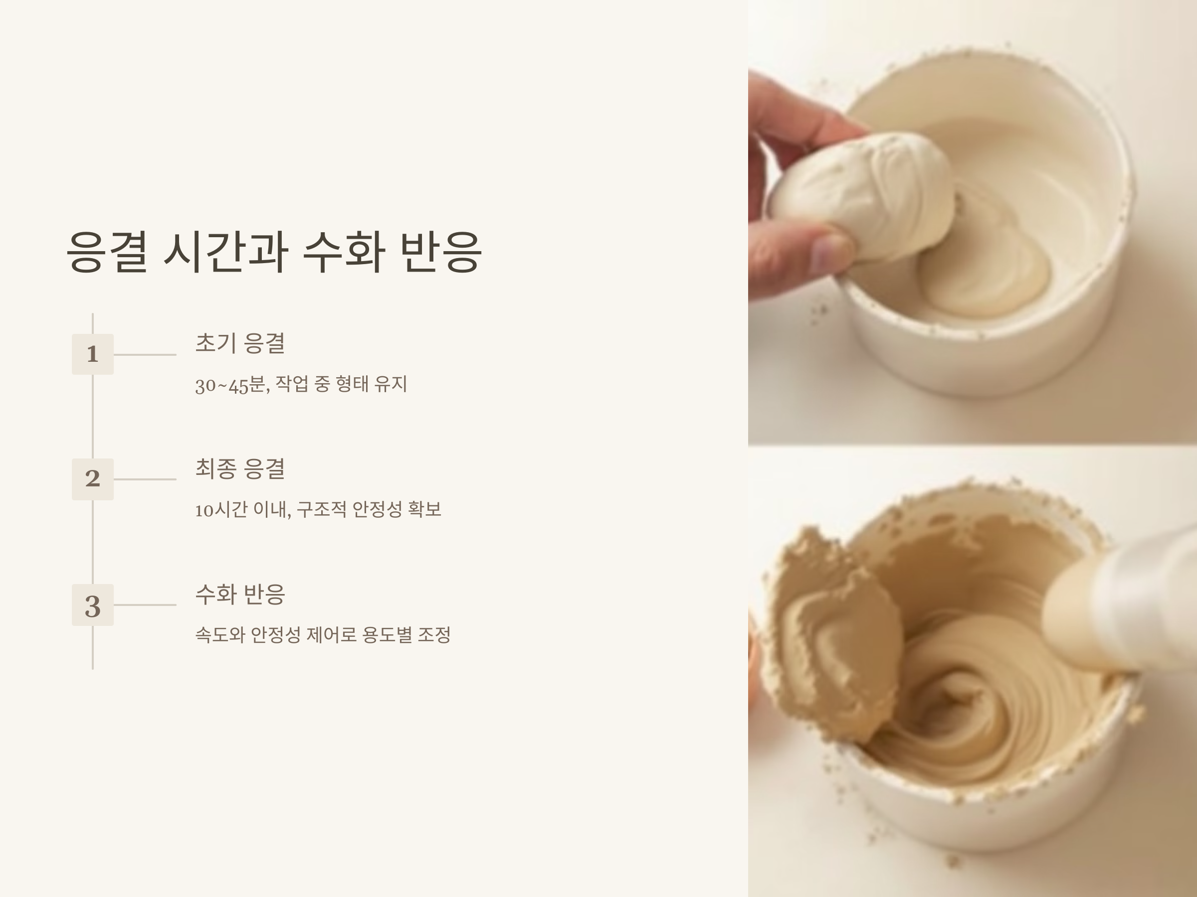 - 초기 응결 시간: 일반적으로 30~45분 사이이며, 작업 중 형태를 유지하기 위해 충분한 시간이 제공됩니다.