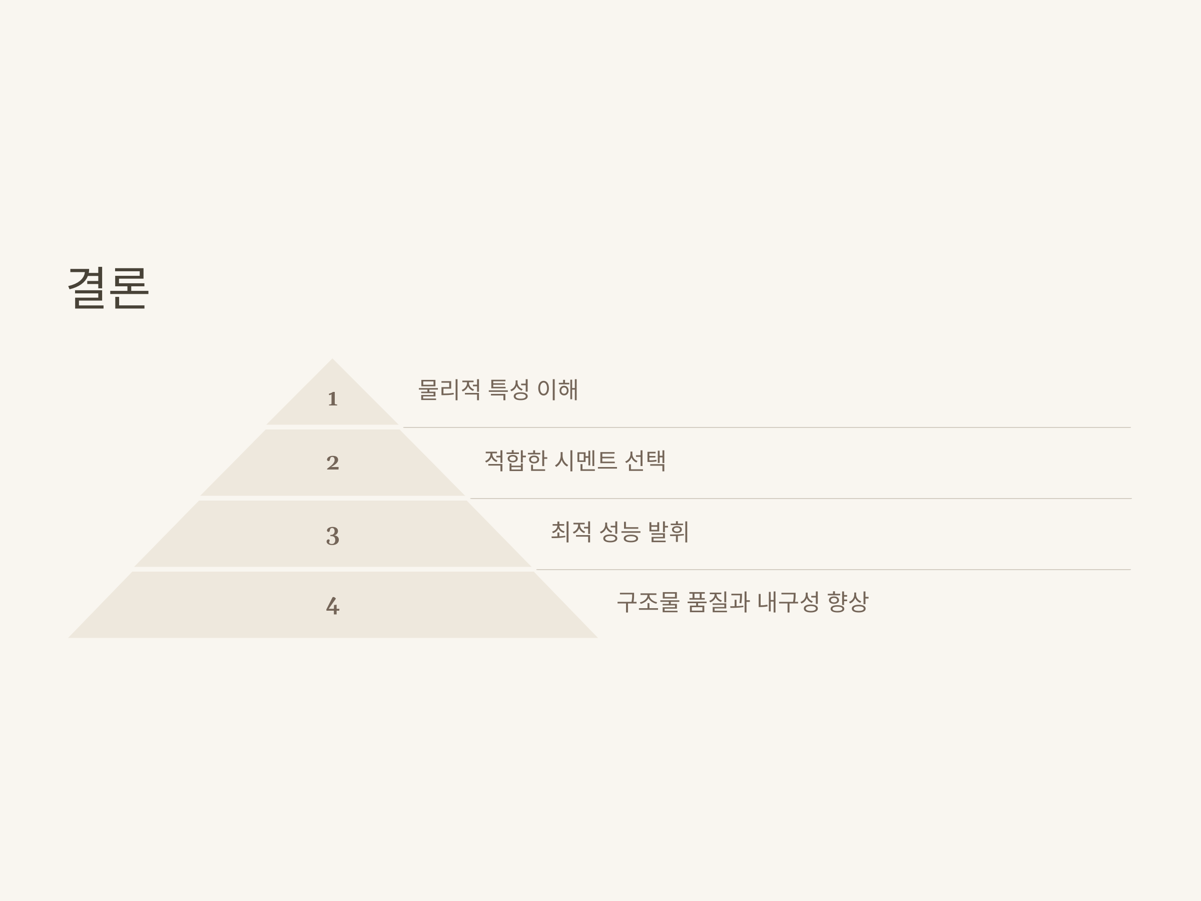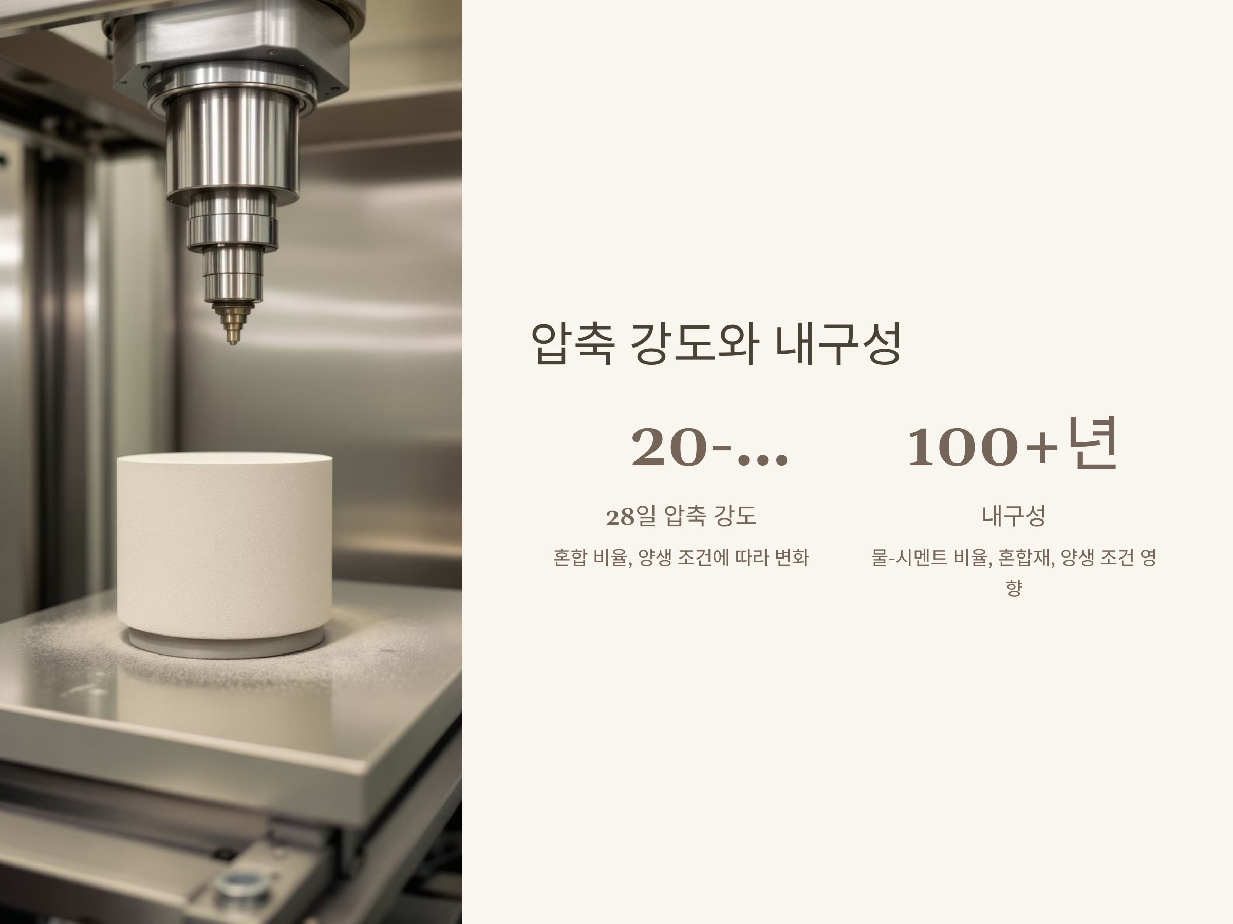 - 내구성: 물-시멘트 비율, 혼합재, 그리고 양생 조건에 의해 크게 영향을 받습니다. 내구성은 구조물의 수명을 결정짓는 핵심 요소입니다.
