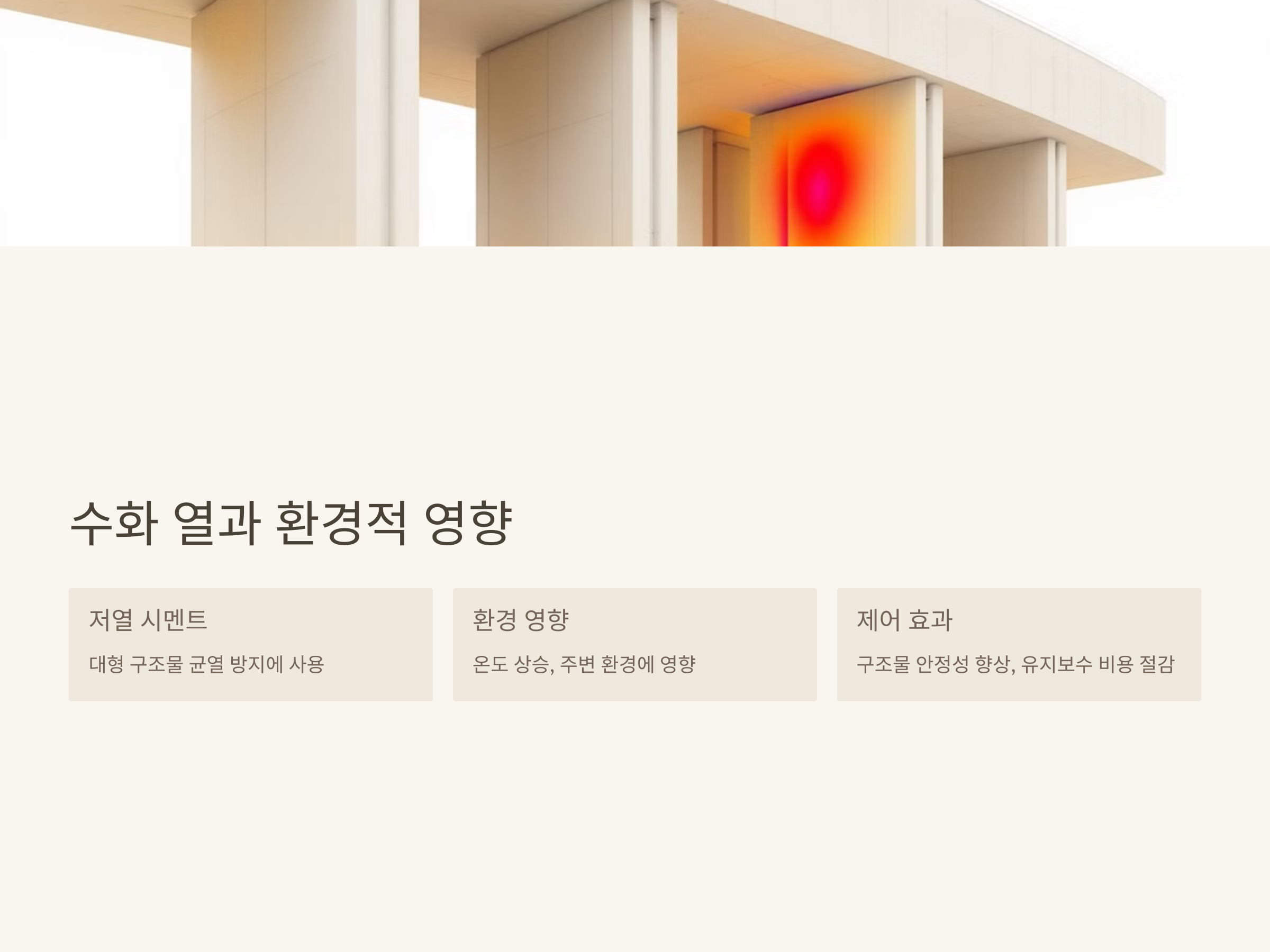 - 환경적 영향: 수화 열과 온도 상승은 주변 환경과 구조물의 상태에 영향을 미치므로, 적절한 설계가 필요합니다.