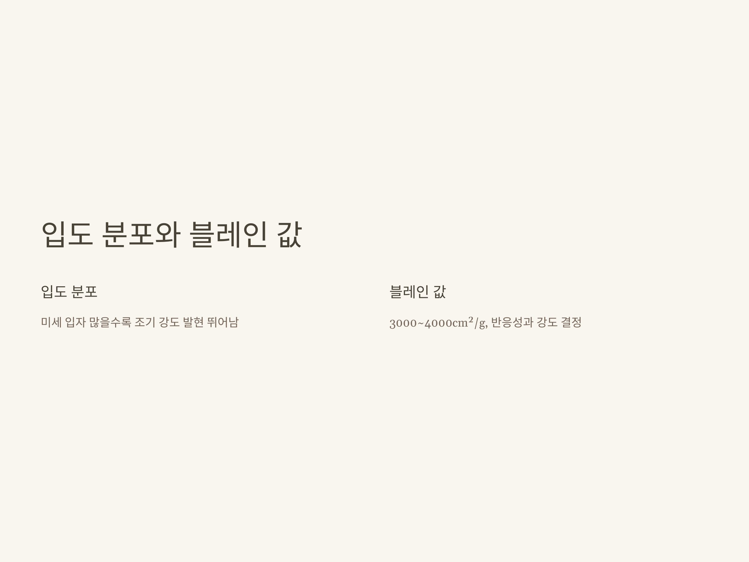- 블레인 값: 입자의 표면적을 나타내는 블레인 값은 시멘트의 분말도가 높을수록 큰 값을 가집니다. 일반적으로 3000~4000cm²/g 정도이며, 이는 시멘트의 반응성과 강도를 결정짓습니다.