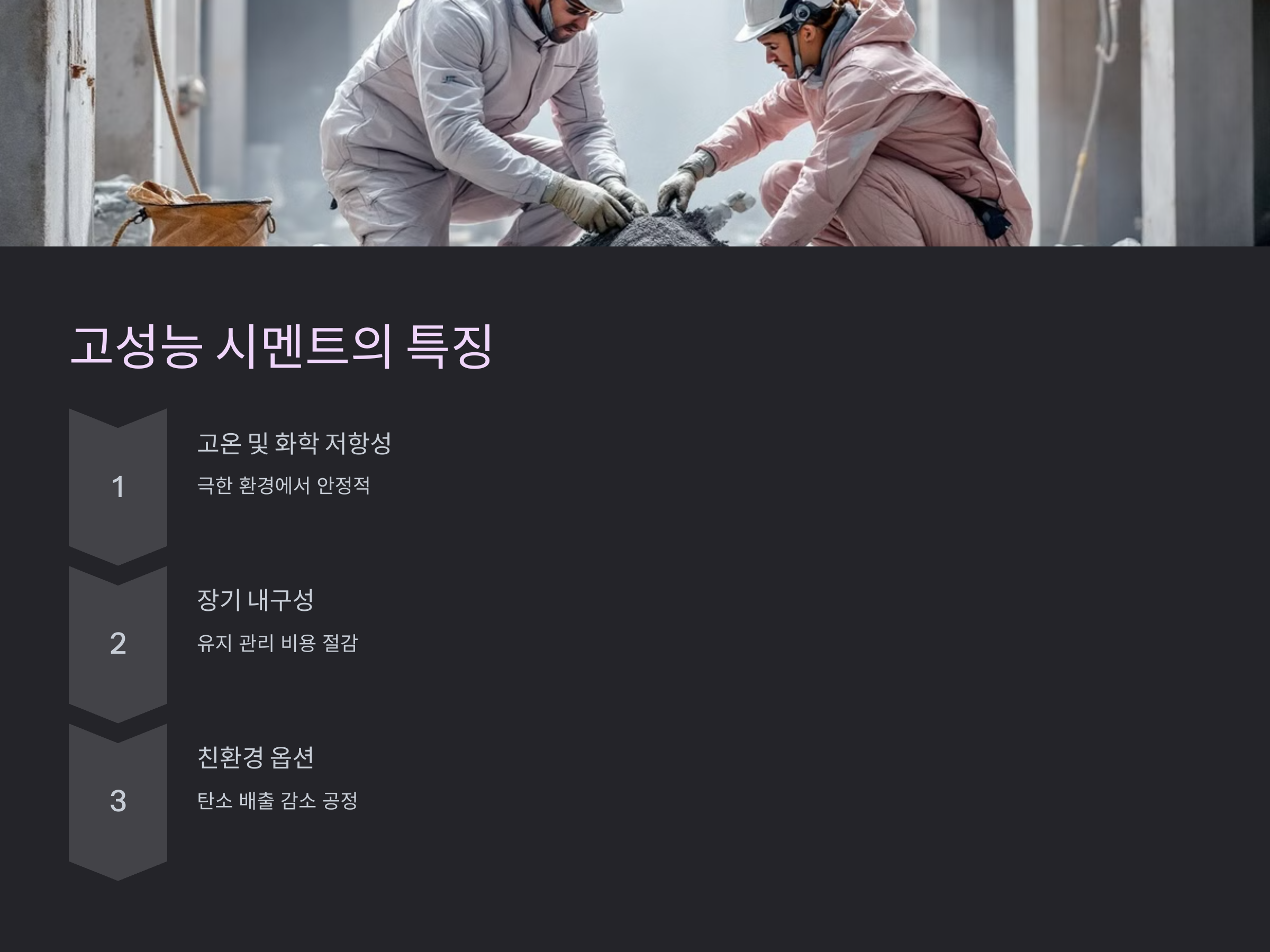 - 친환경 옵션: 고성능 시멘트는 탄소 배출을 줄이는 제조 공정을 적용합니다.