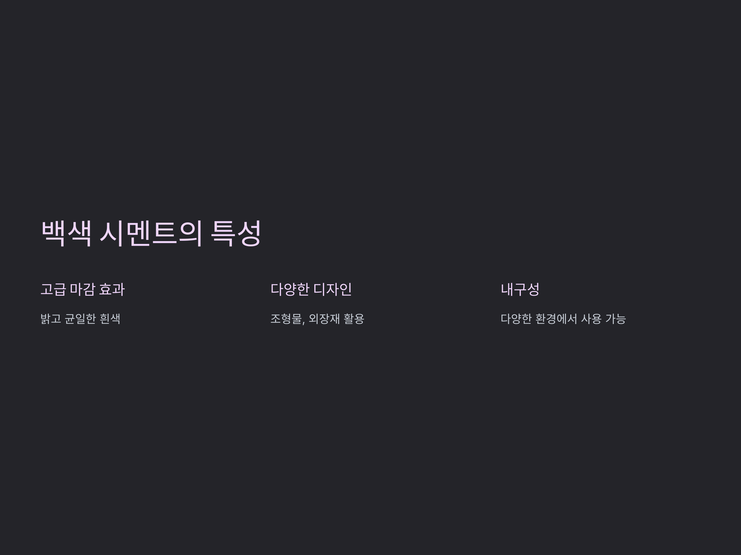 백색 시멘트는 미적 완성도를 높이는 데 초점이 맞춰져 있으며, 주로 외관 마감재로 사용됩니다. 고급스러운 외관이 요구되는 공사에 필수적입니다.