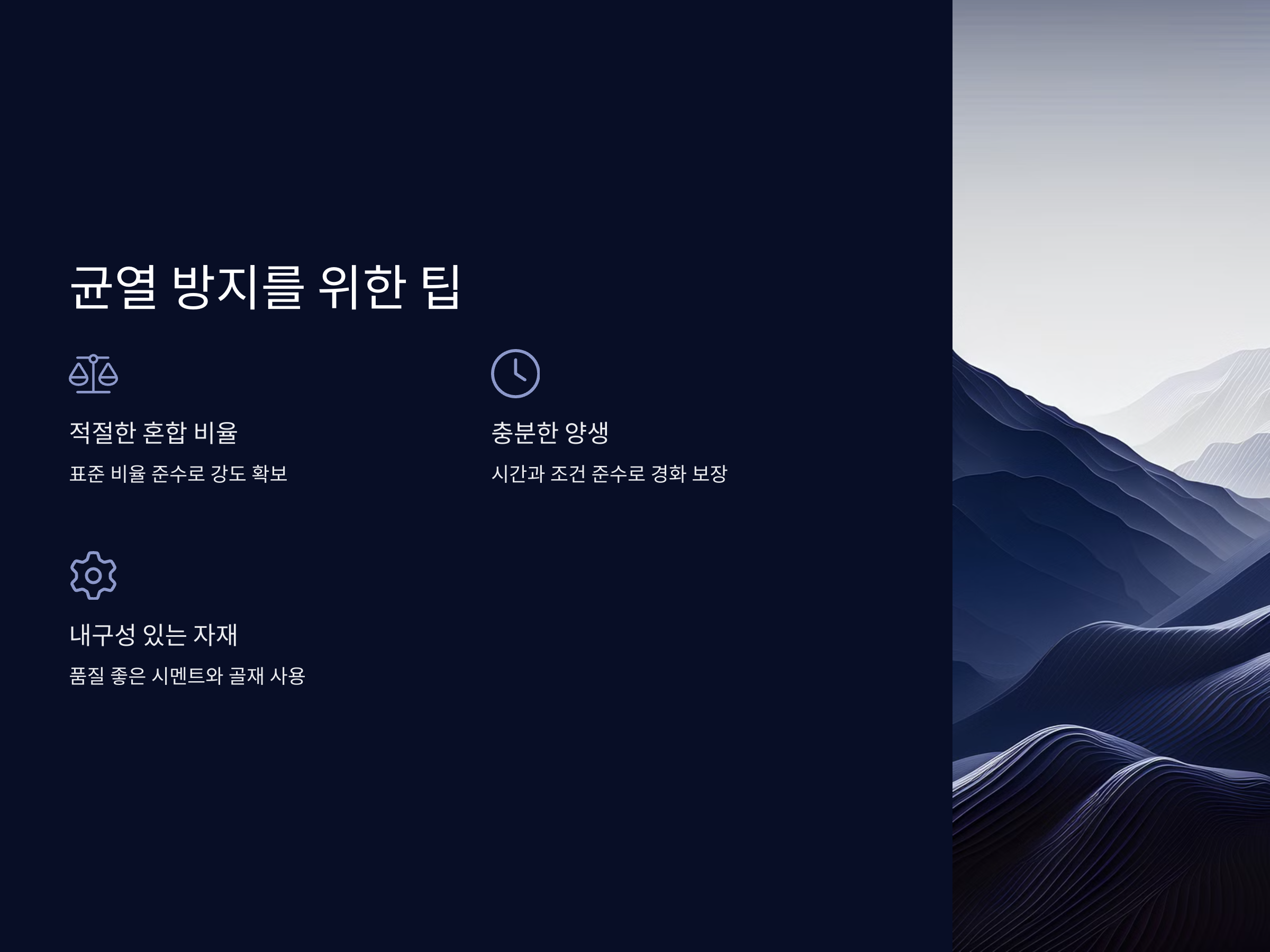 - 해결 방법: 표준화된 혼합 비율 준수와 고품질 자재 사용