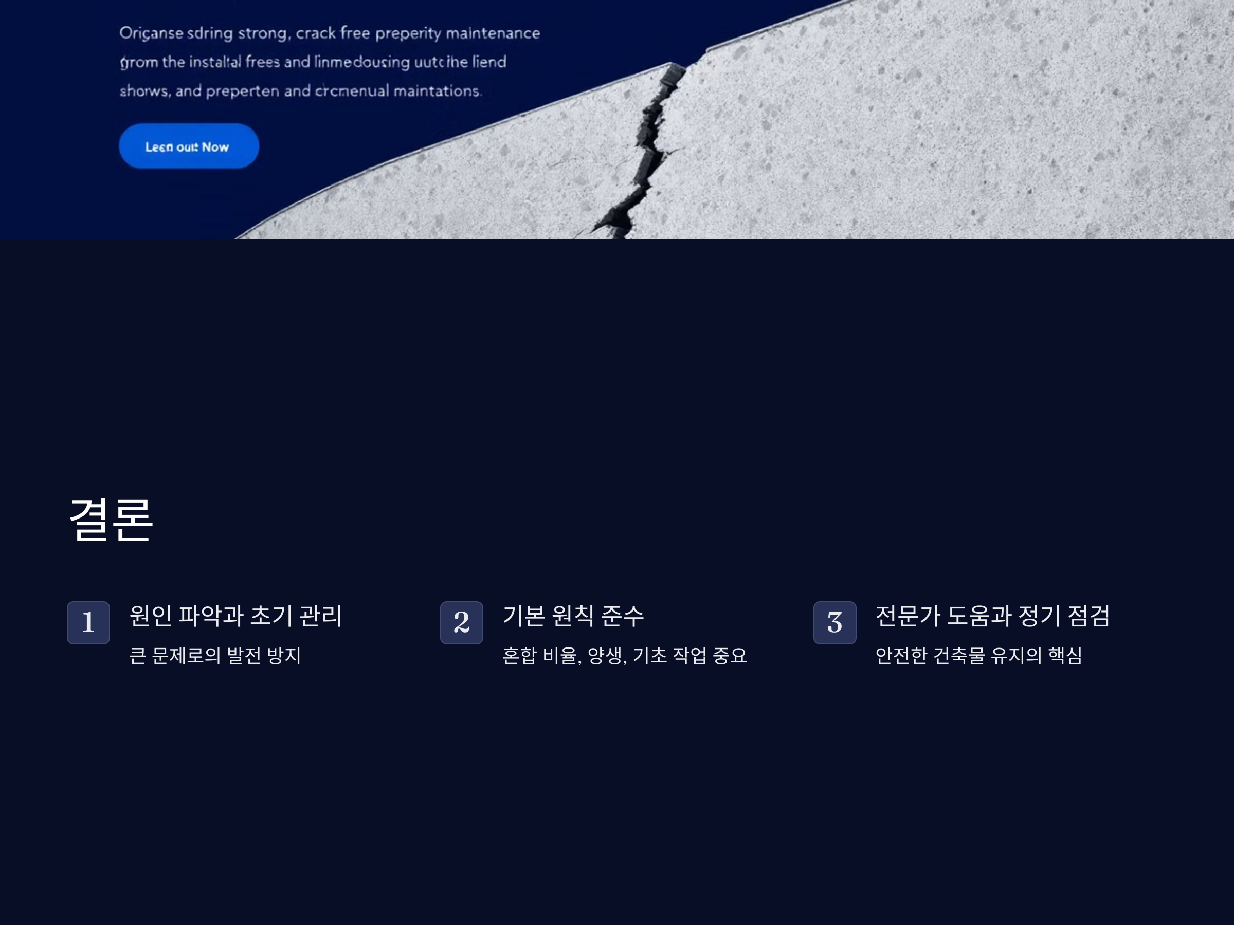 시멘트 균열은 발생 원인을 정확히 파악하고 초기 단계에서 관리하면 큰 문제로 발전하지 않습니다. 혼합 비율, 양생, 기초 작업 등 기본 원칙을 철저히 지키는 것이 중요하며, 최신 기술과 자재를 활용하면 더욱 안전한 건축물이 완성될 수 있습니다. 전문가의 도움과 정기 점검을 통해 균열 문제를 예방하고 유지 관리에 힘쓰세요.
