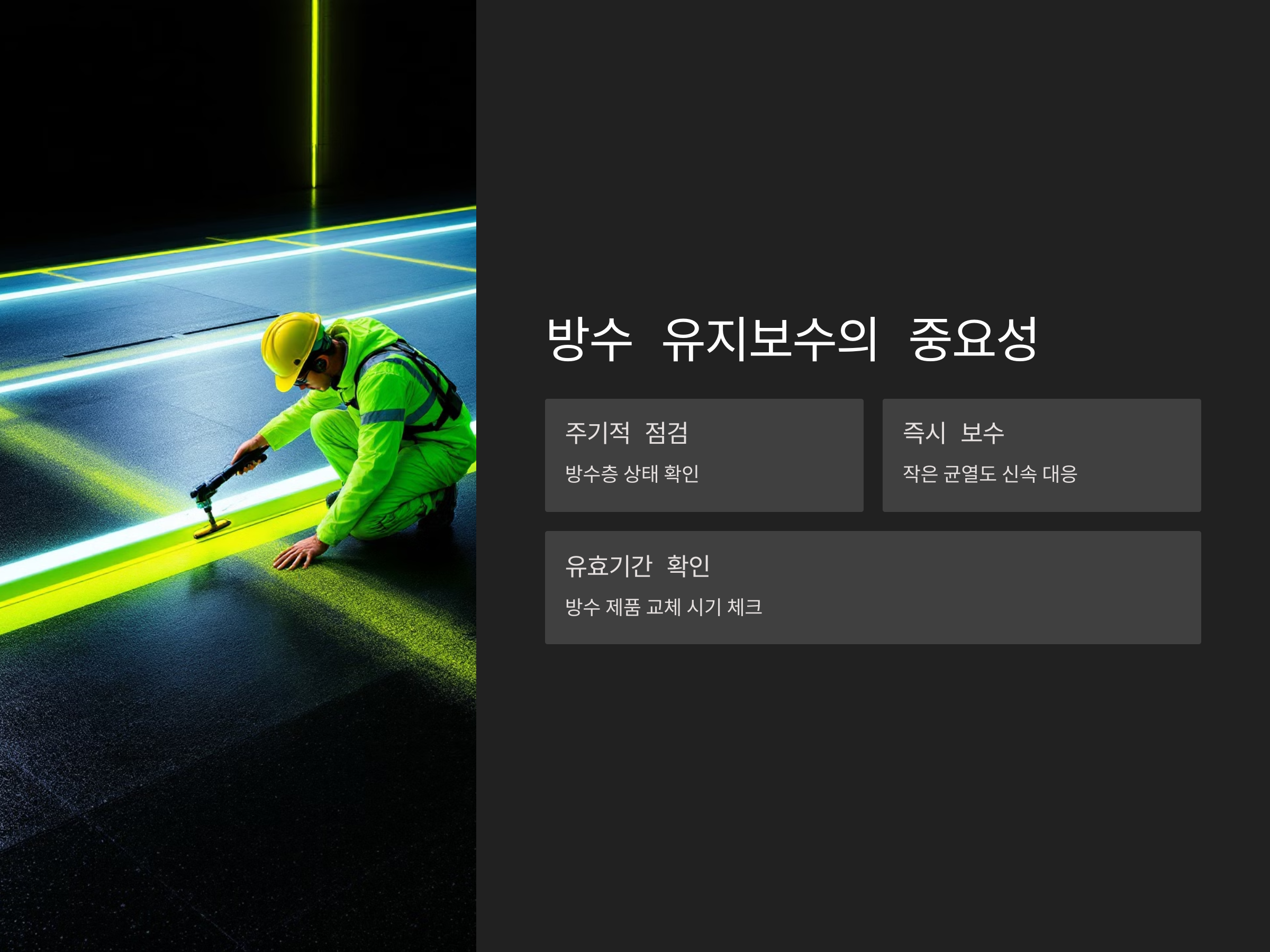 시공 시 방수 성능을 극대화하려면 아래의 방법을 따르세요.