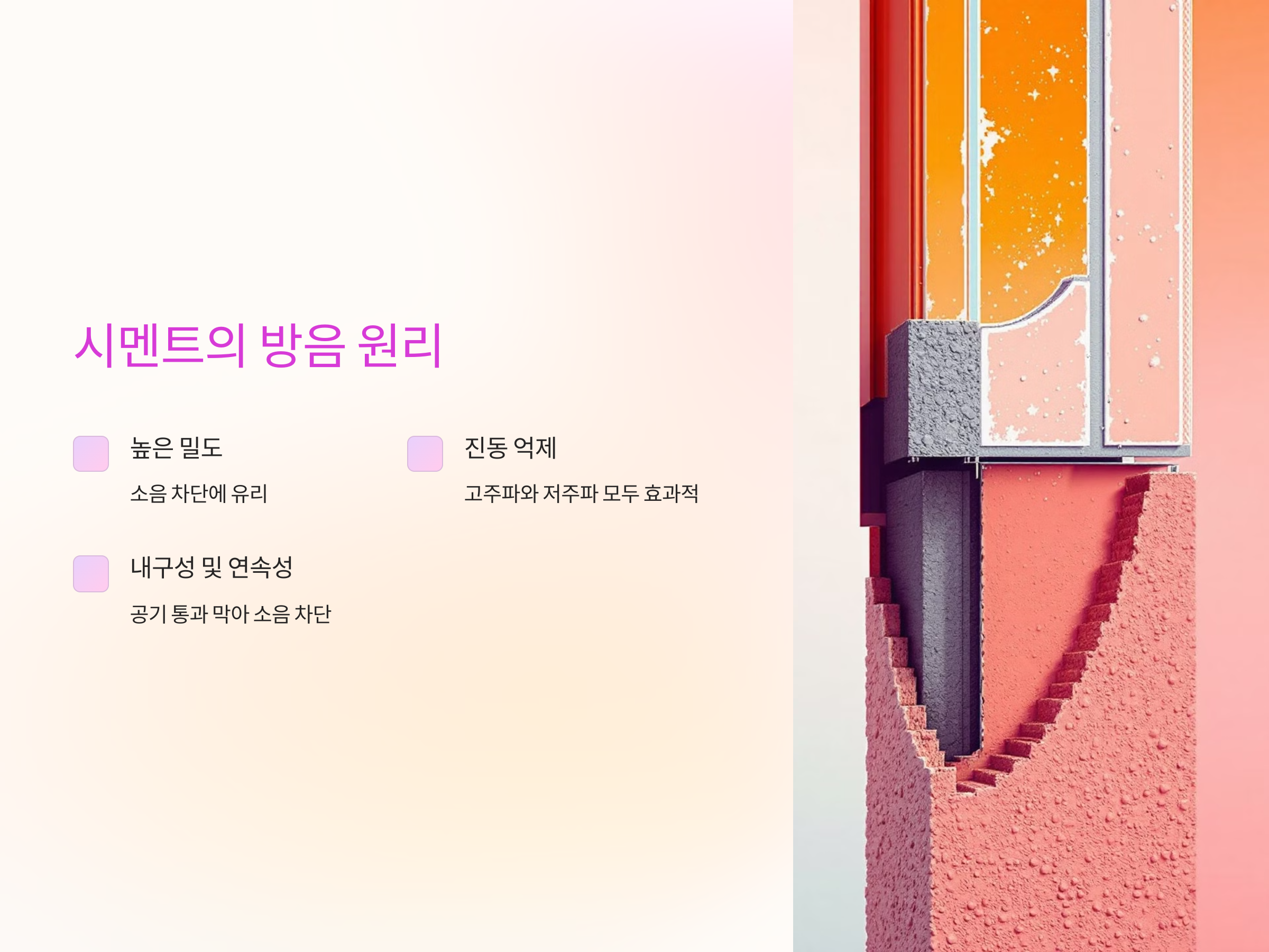 시멘트는 밀도가 높은 건축 자재로, 소리가 이를 통과하는 동안 에너지를 잃도록 돕습니다. 이는 다음과 같은 물리적 특성에 기인합니다.