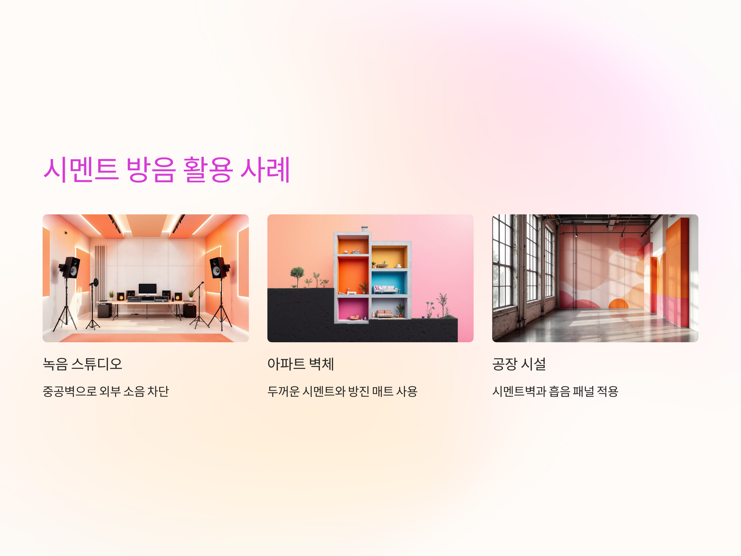 - 진동 억제: 시멘트 벽체는 고주파와 저주파 모두에 효과적인 방음 성능을 제공합니다.