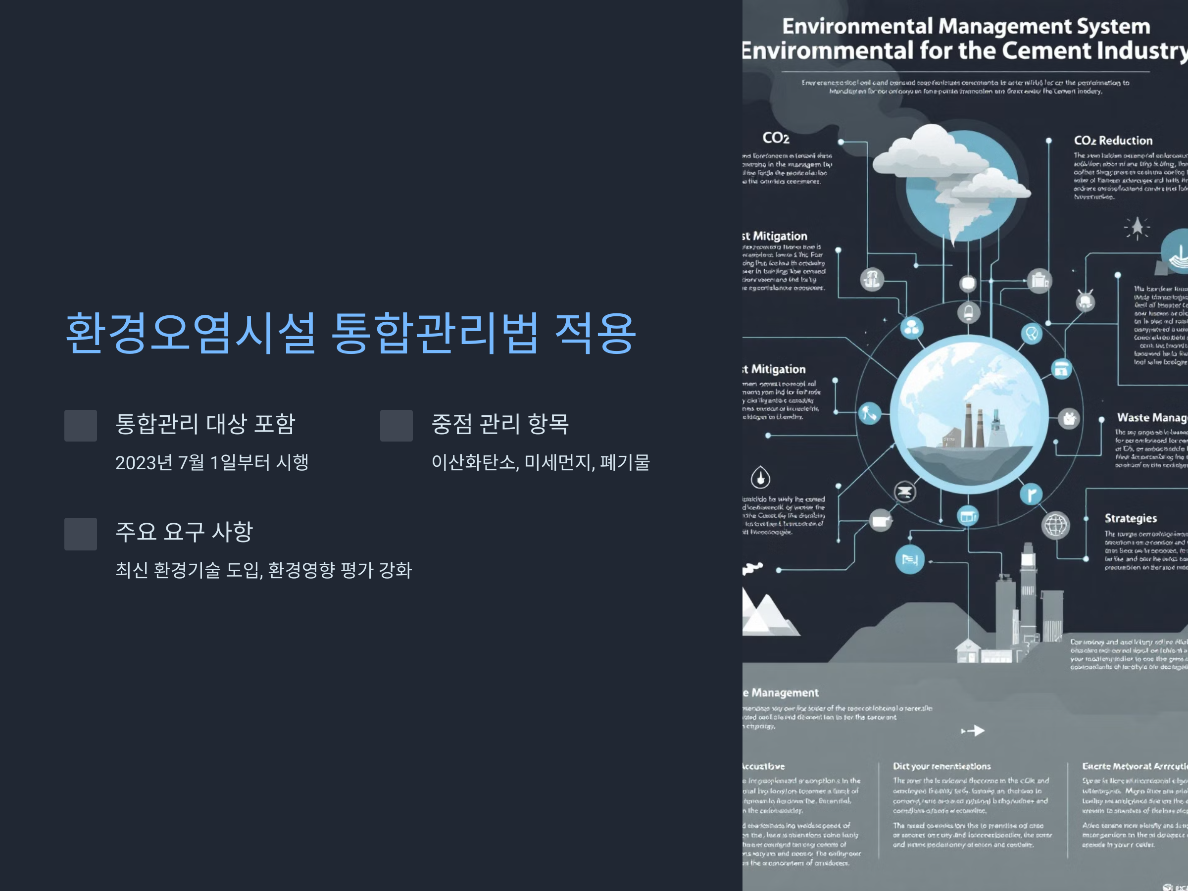 2023년 7월 1일부터 시멘트 제조업은 '환경오염시설의 통합관리에 관한 법률' 적용을 받게 되었습니다. 이는 제조 과정에서 배출되는 온실가스와 미세먼지 등 환경오염 물질의 체계적인 관리와 감축을 목표로 합니다.