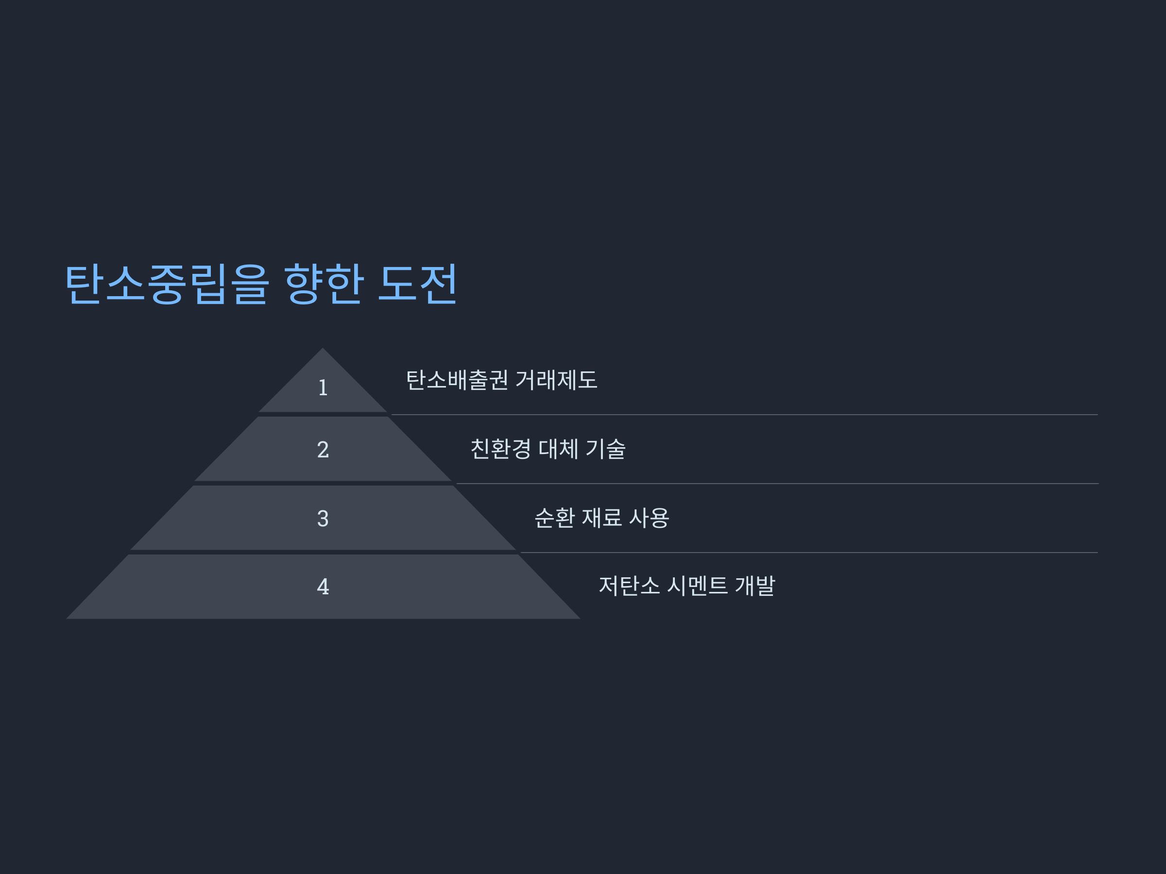 - 탄소배출권 거래제도 도입: 시멘트 제조업체는 연간 탄소 배출량에 따라 배출권을 구매하거나 절감해야 합니다.