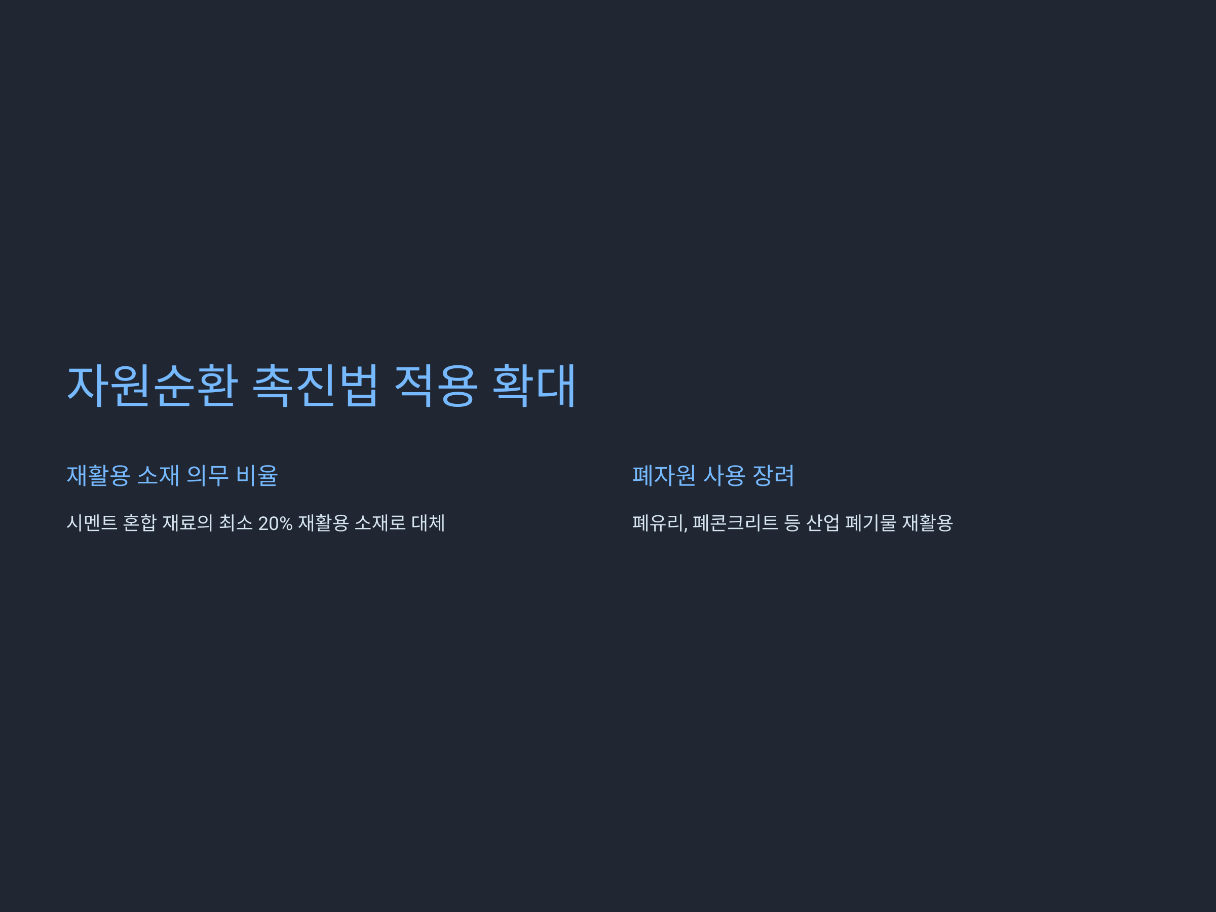 2022년부터 시행된 '자원순환기본법'은 시멘트 산업에도 큰 영향을 미칩니다. 특히 폐기물의 재활용 비율을 높이고 천연 자원 소비를 줄이는 방향으로 규제가 강화되었습니다.