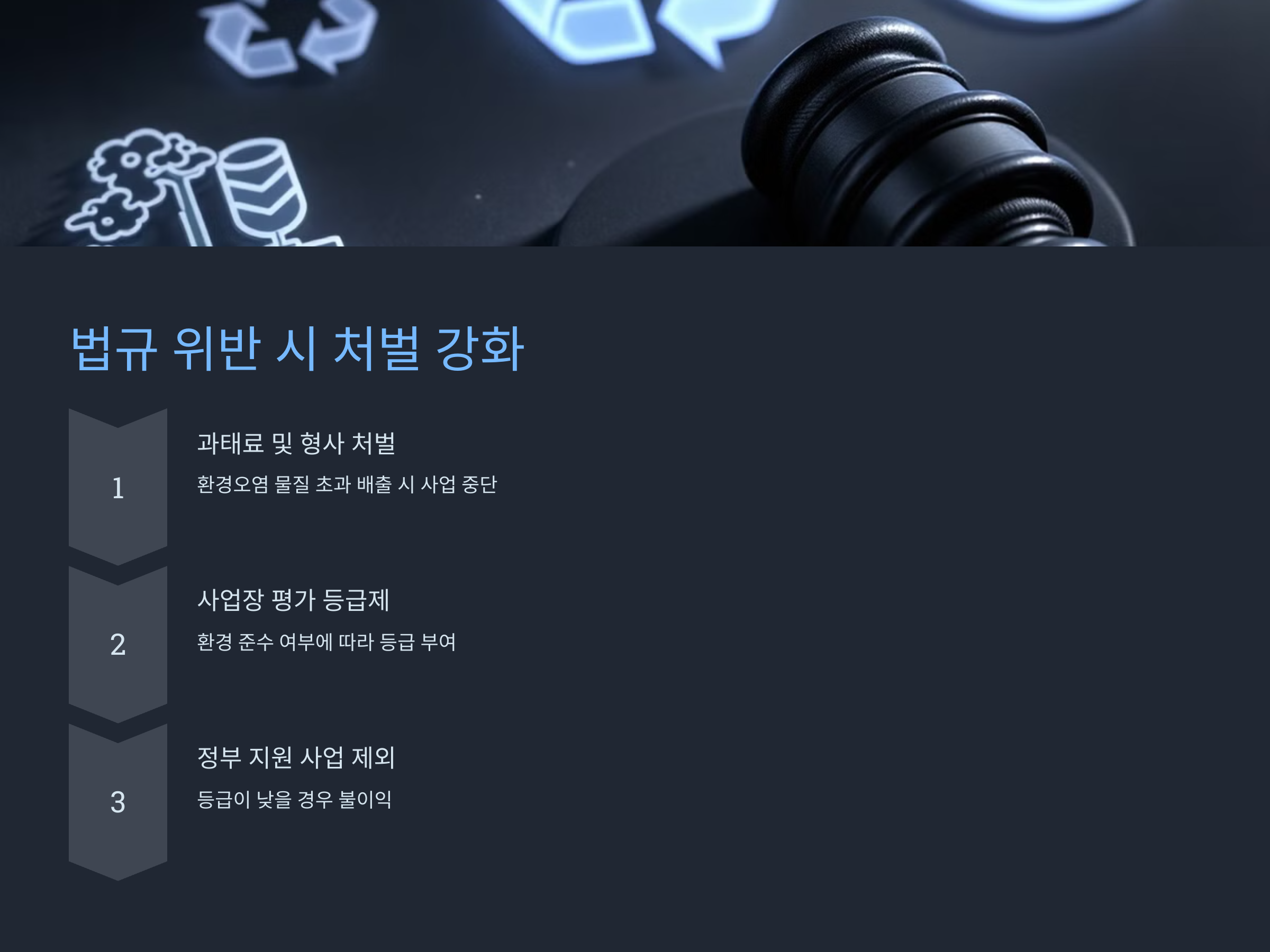- 과태료 및 형사 처벌: 환경오염 물질 초과 배출 시 사업 중단 명령