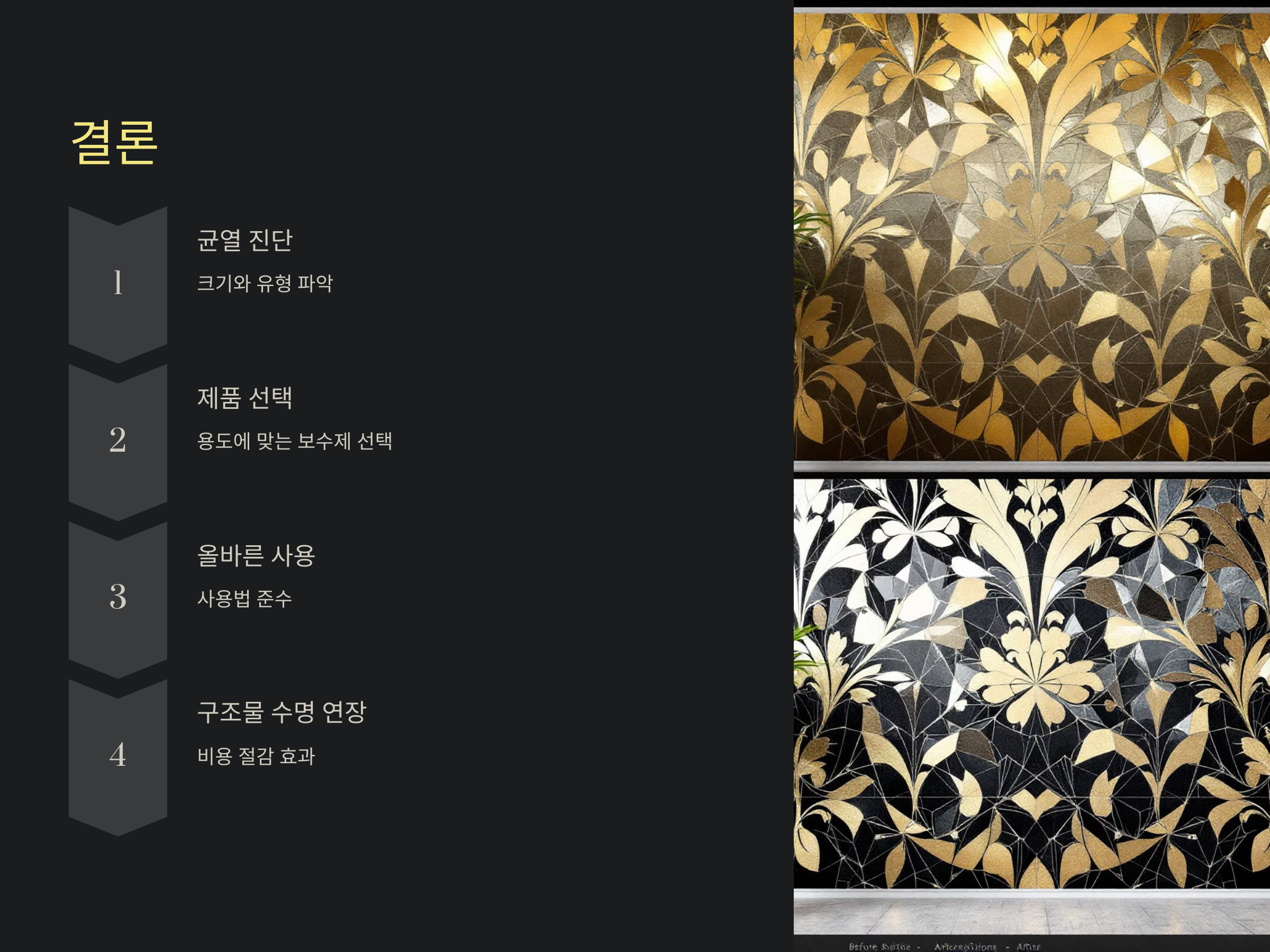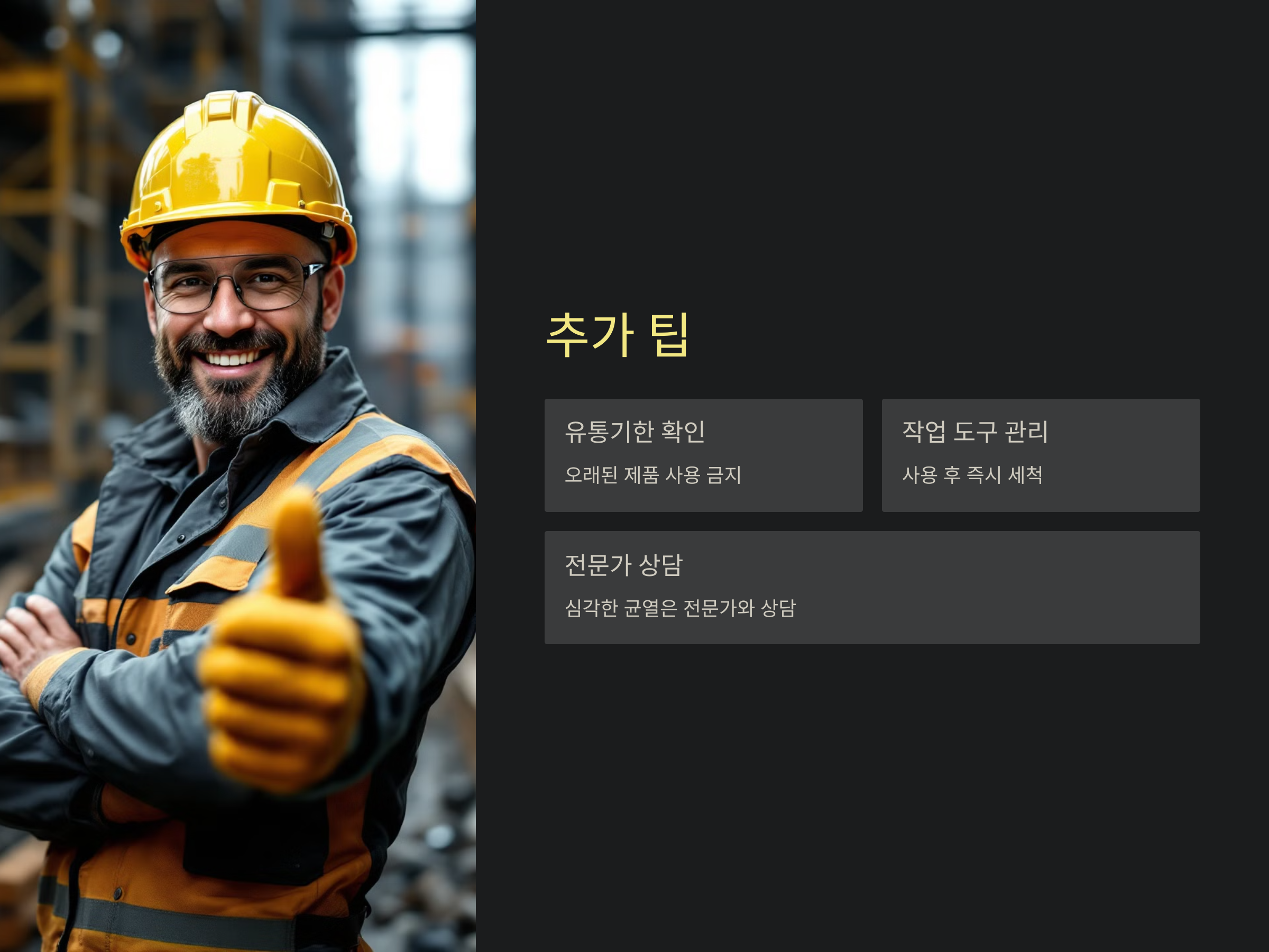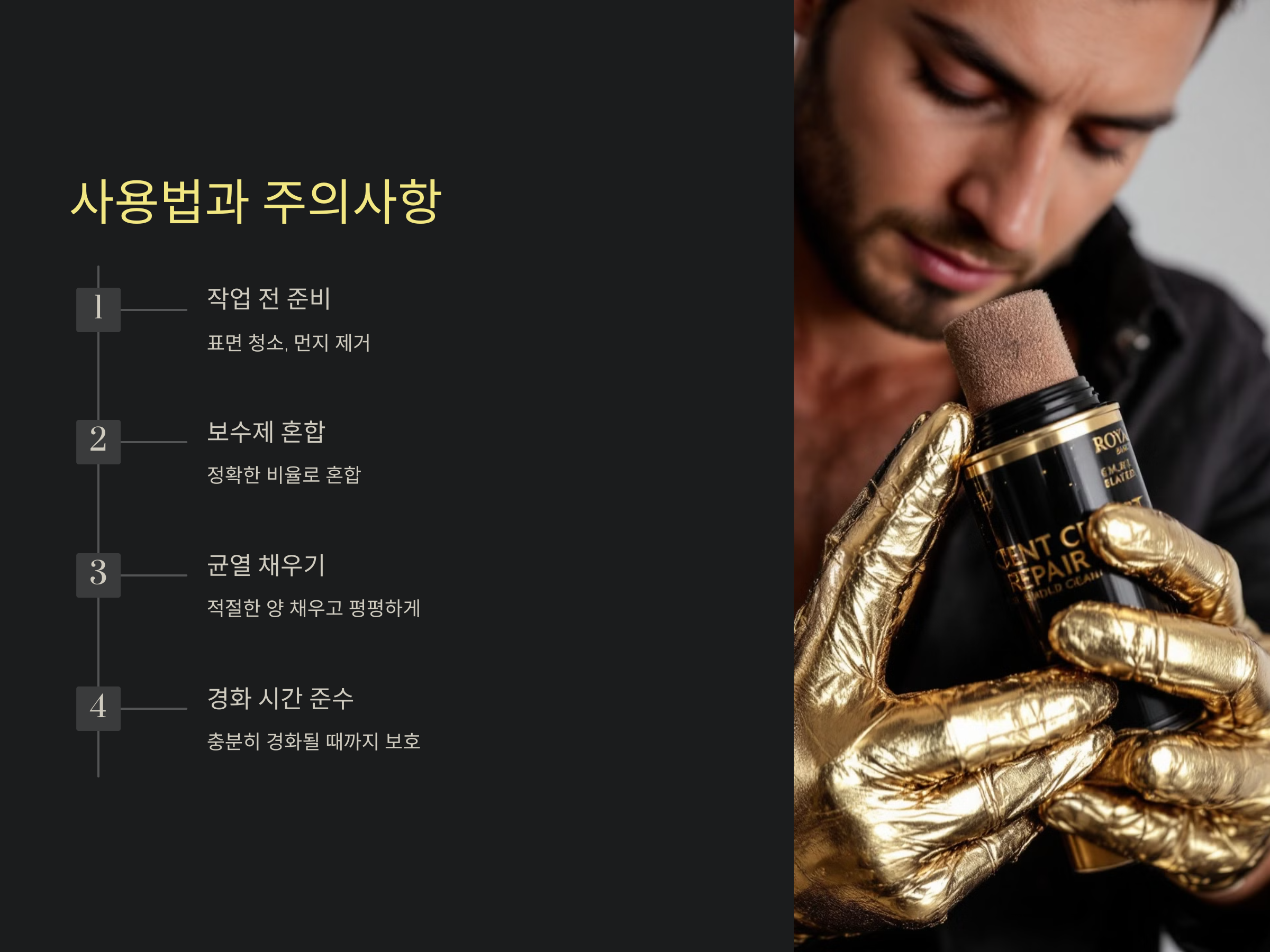 사용 전, 균열 상태와 크기를 정확히 진단하고 제품 설명서를 꼼꼼히 확인하는 것이 필수입니다.
