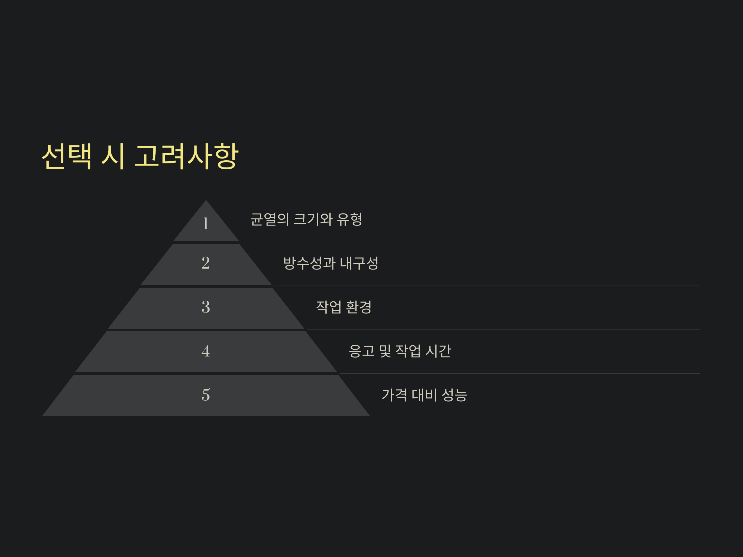 - 미세한 균열에는 폴리머 개질 시멘트, 큰 균열에는 에폭시 보수제가 효과적입니다.