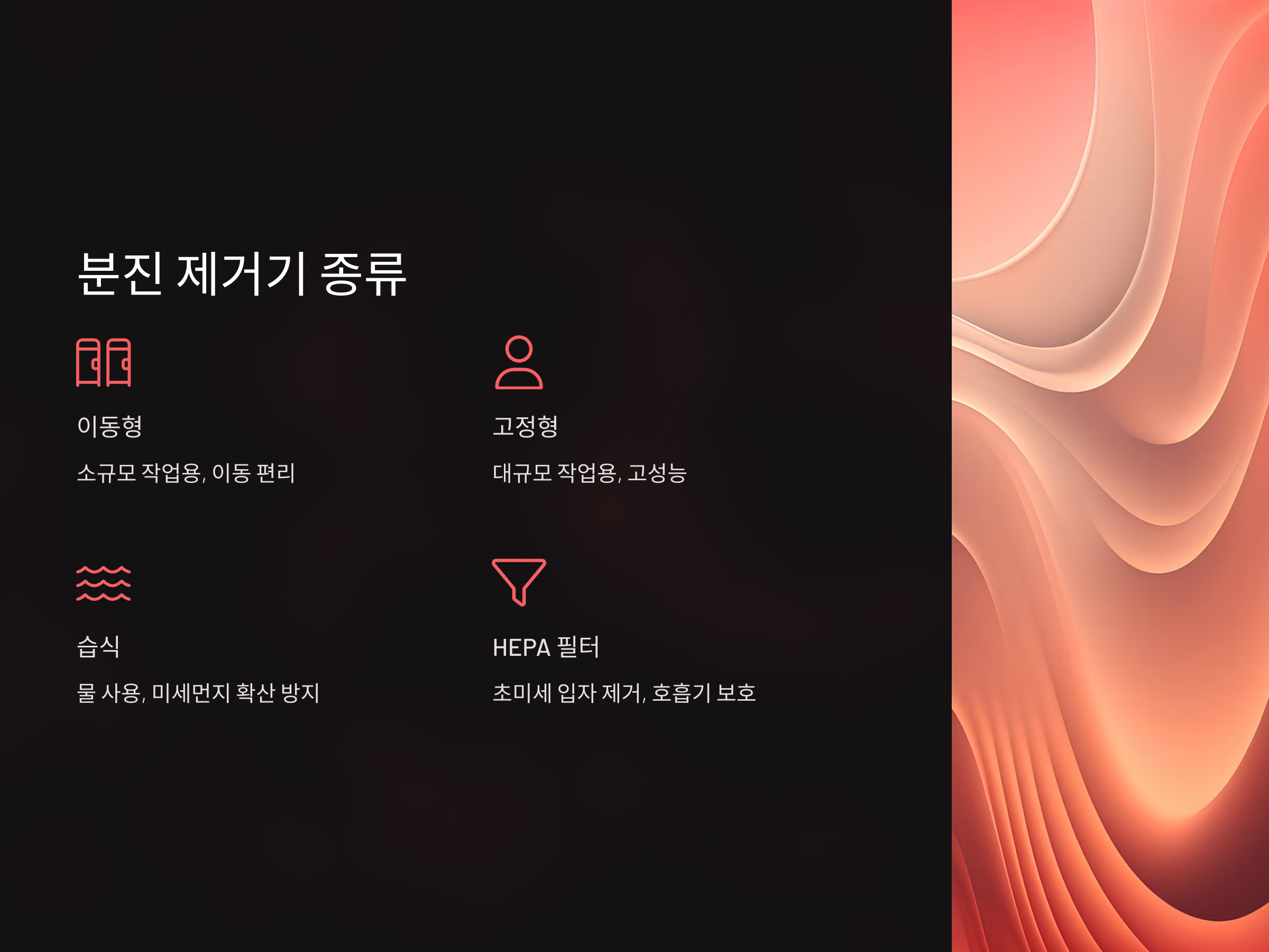 - 장점: 초미세 입자까지 제거 가능해 작업자의 호흡기를 효과적으로 보호합니다.