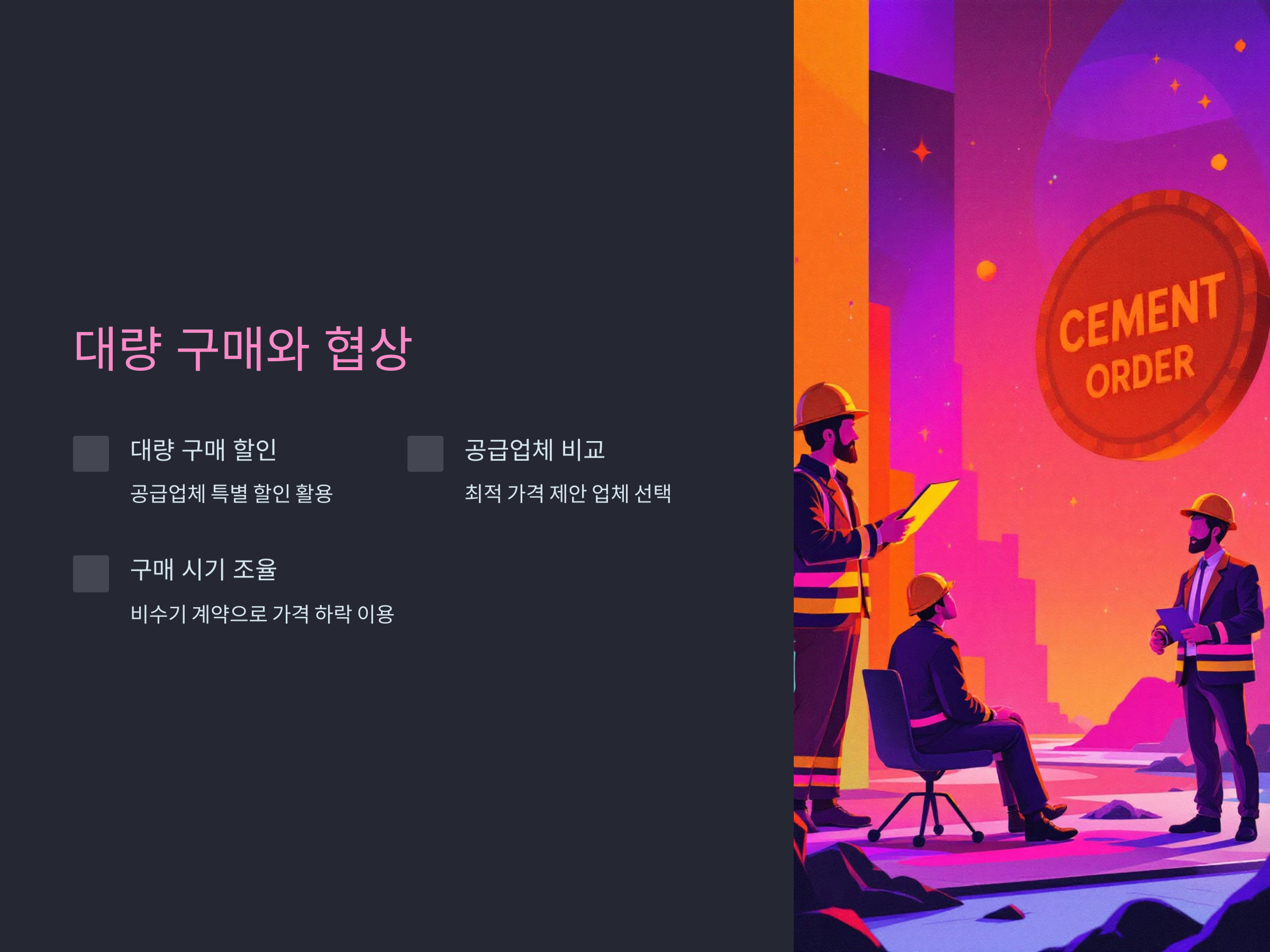 - 구매 시기 조율: 건설 비수기에는 시멘트 가격이 하락하는 경향이 있습니다. 비수기에 구매 계약을 체결해보세요.