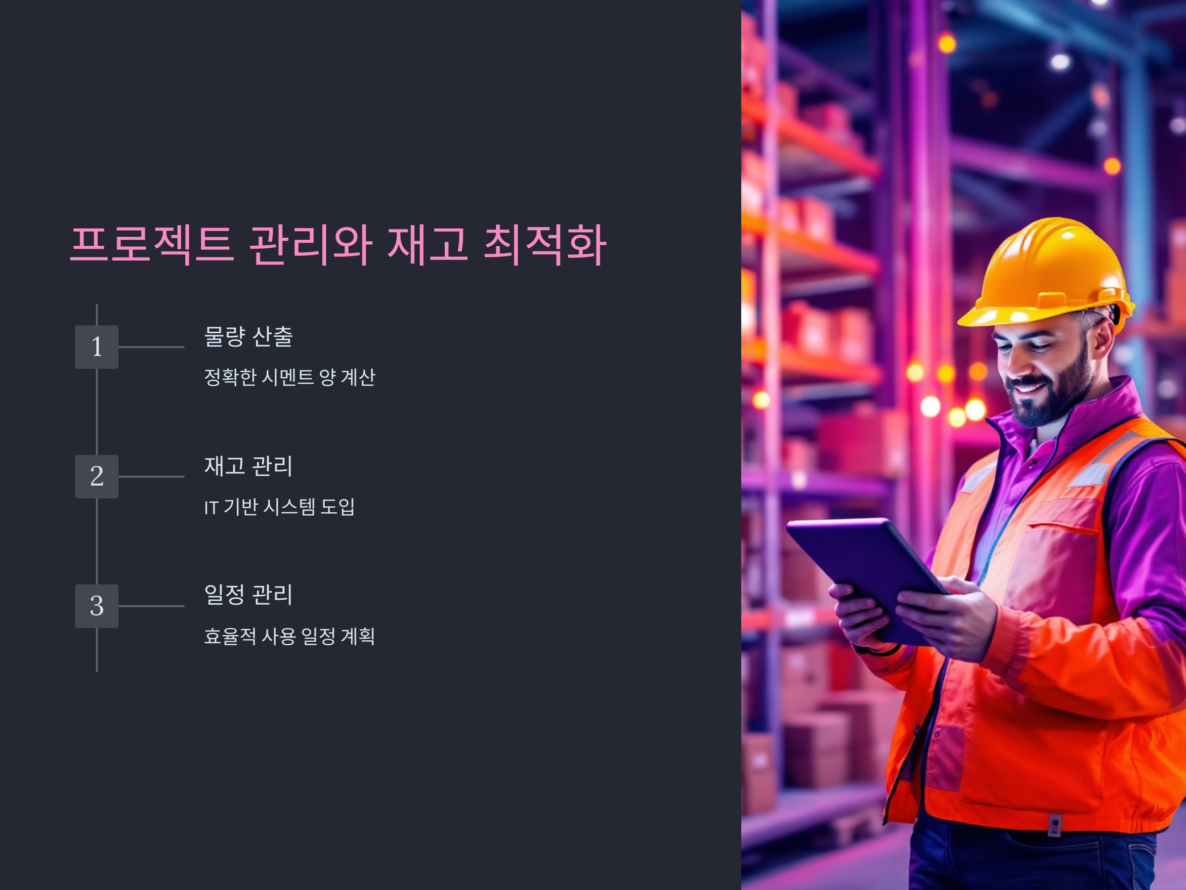 철저한 프로젝트 관리는 시멘트 비용 절감에 핵심적인 역할을 합니다. 정확한 계획과 재고 관리를 통해 불필요한 낭비를 방지하세요.
