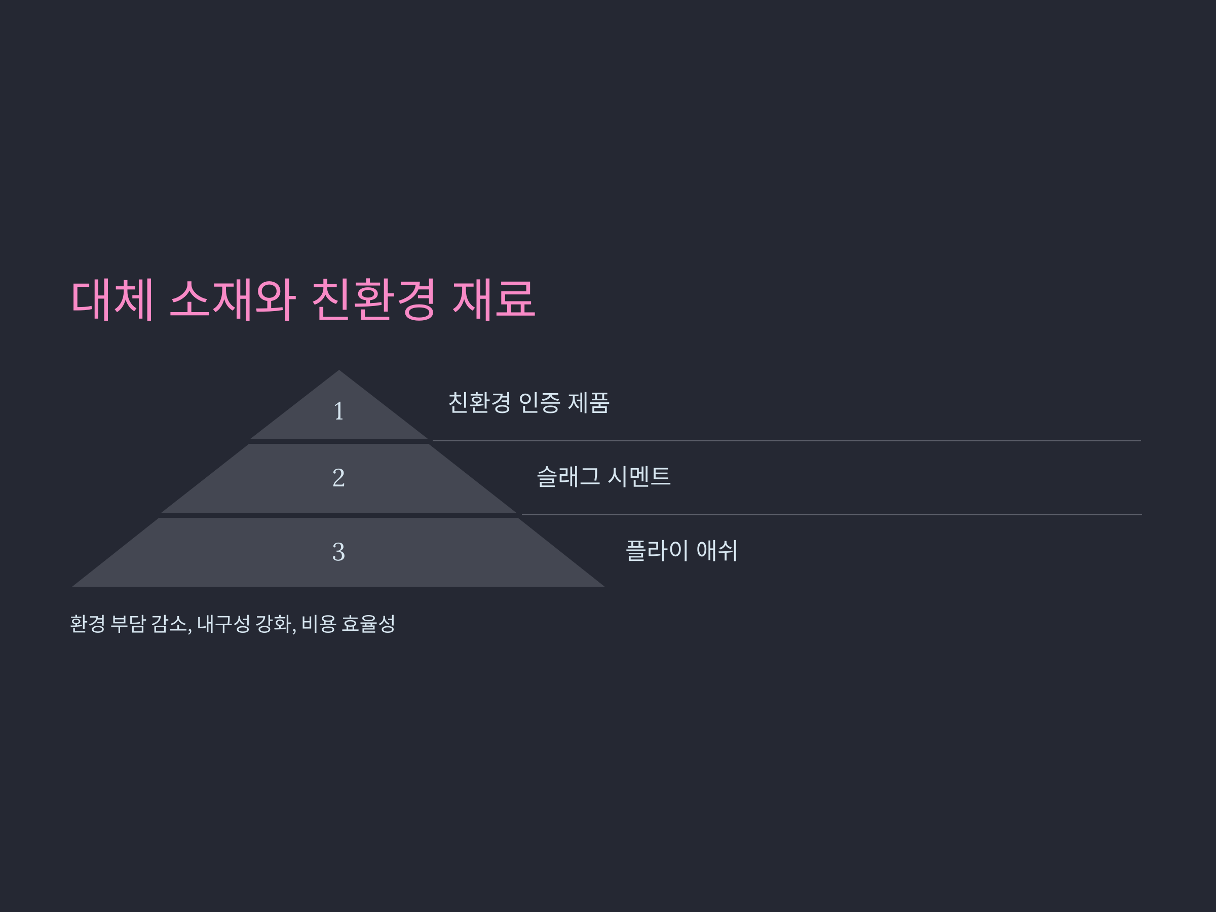 최근 건설 업계에서는 대체 소재와 친환경 재료가 주목받고 있습니다. 이는 시멘트 사용량을 줄이는 동시에 환경에 긍정적인 영향을 미칠 수 있습니다.