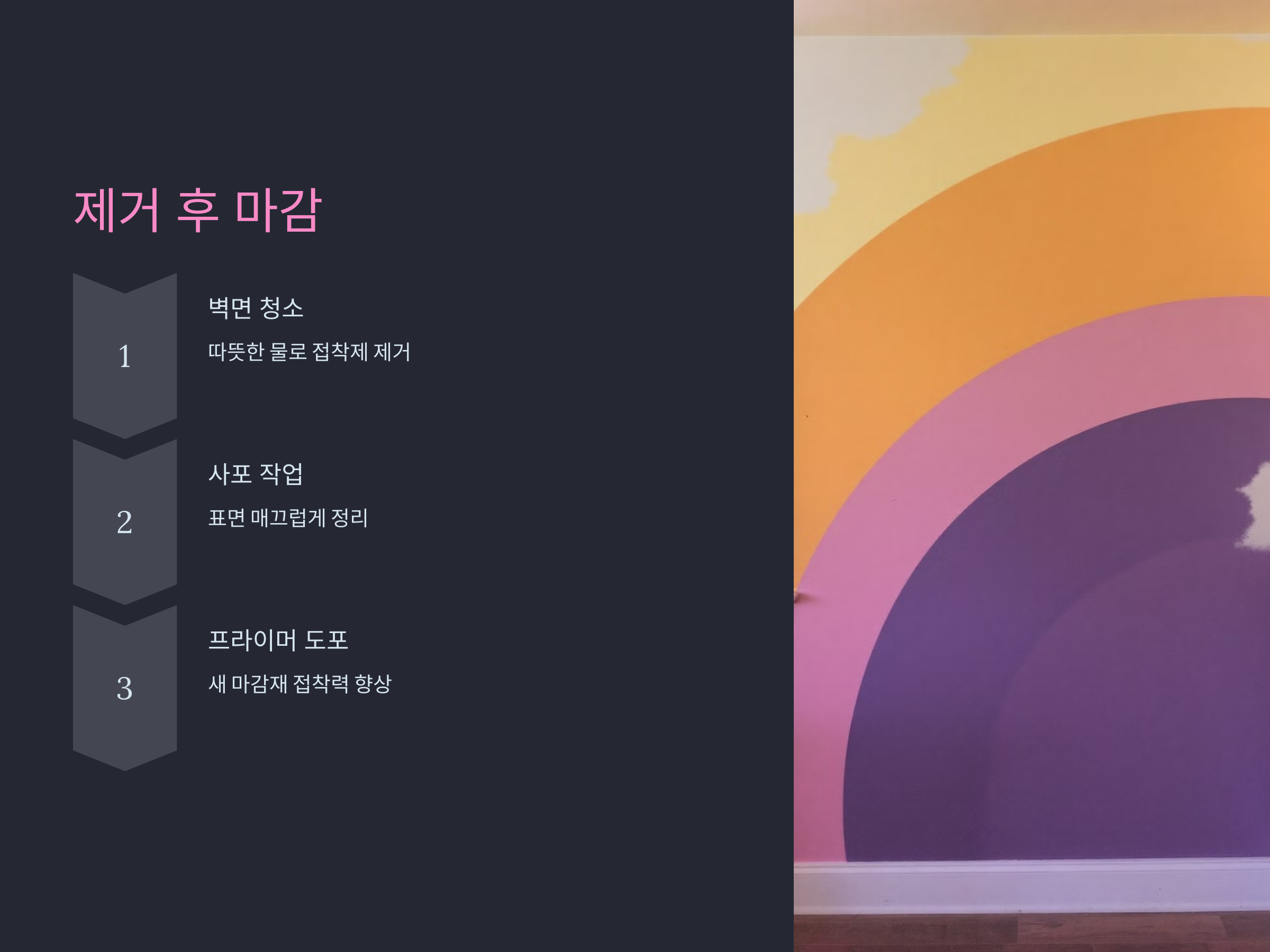 - 과정: 손상 부위를 정리하고, 몰탈로 평평하게 메우는 작업이 필요합니다.