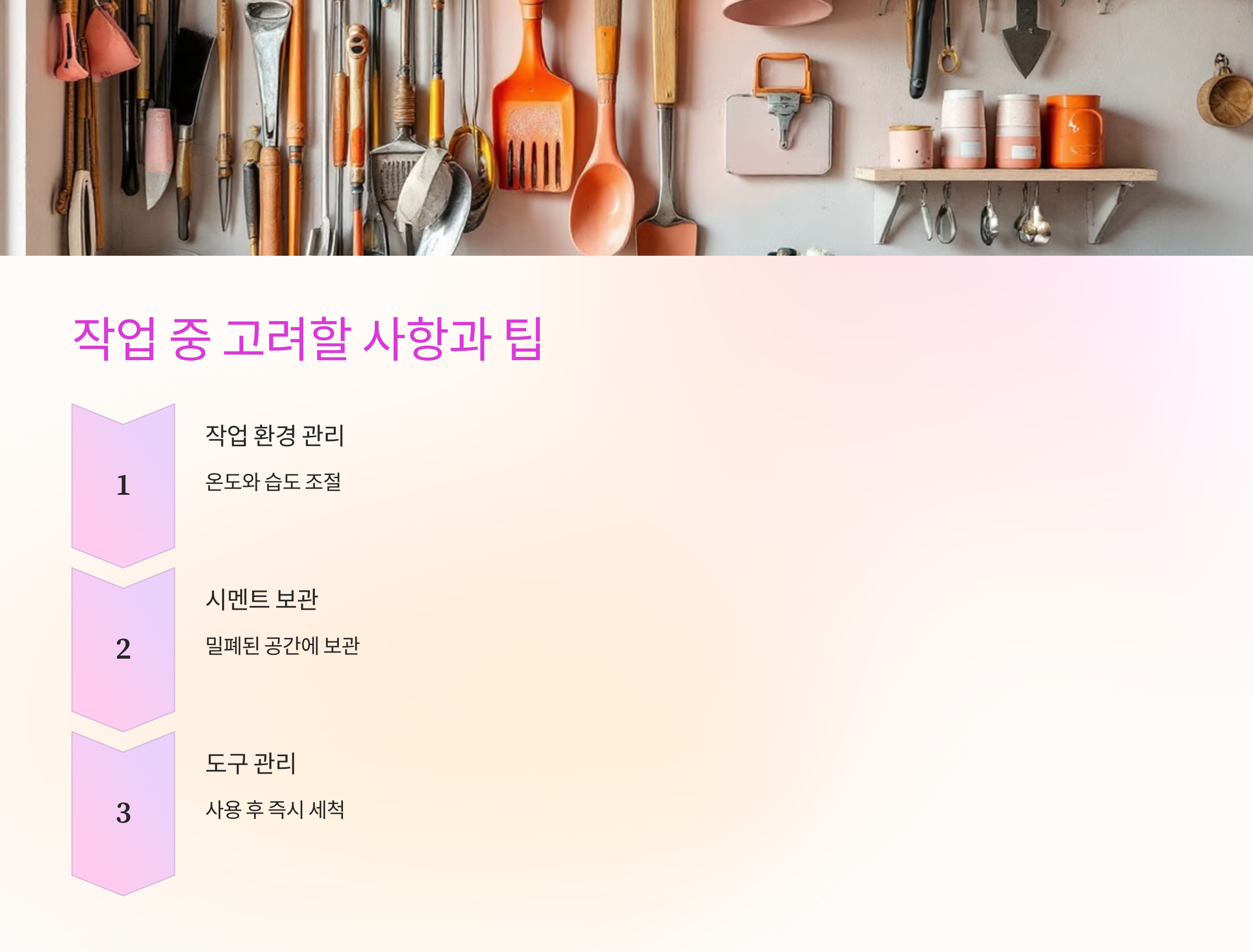 작업 도구뿐 아니라 환경 관리와 보관 방법까지 신경 쓰면 시멘트 작업의 결과가 더 나아집니다.