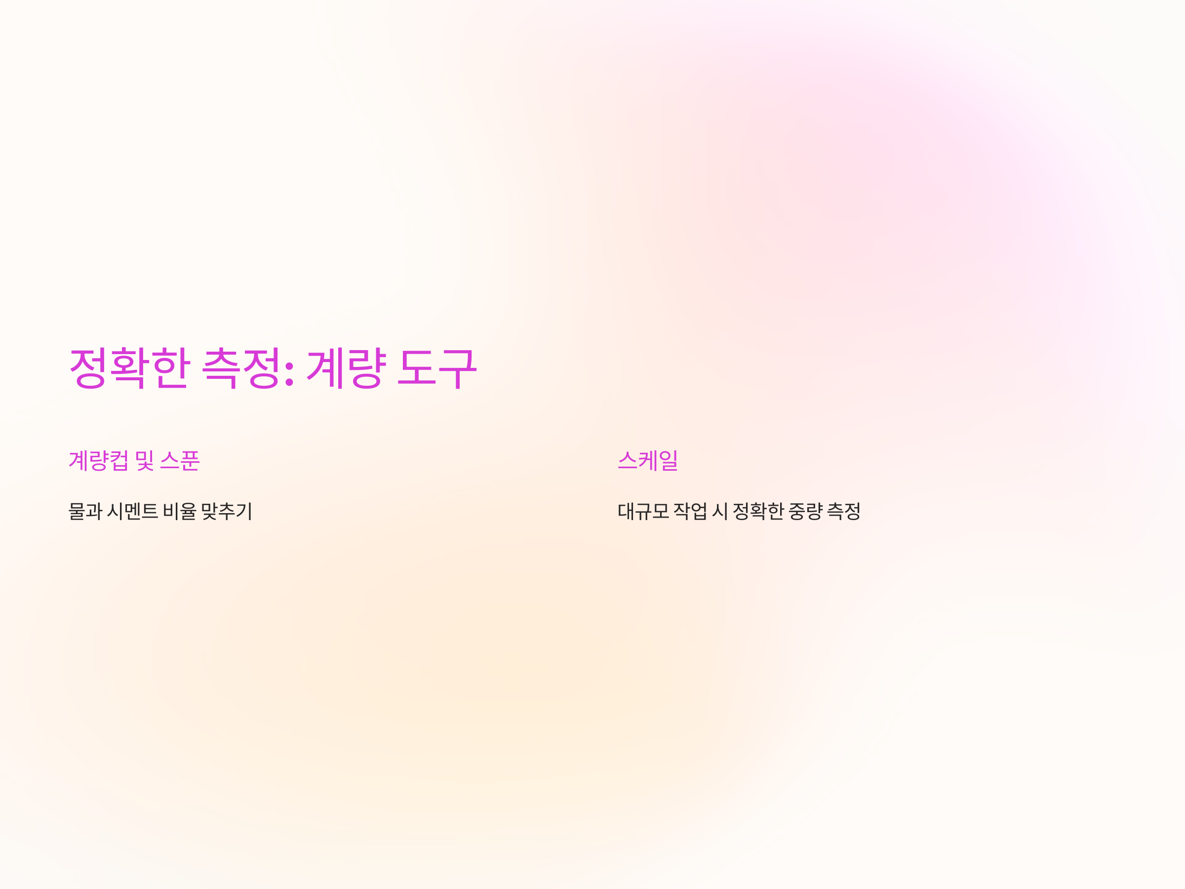 정확한 계량은 시멘트의 강도와 내구성을 보장하는 핵심 요소입니다. 물을 너무 많이 넣으면 약해지고, 반대로 적게 넣으면 혼합이 어렵습니다.